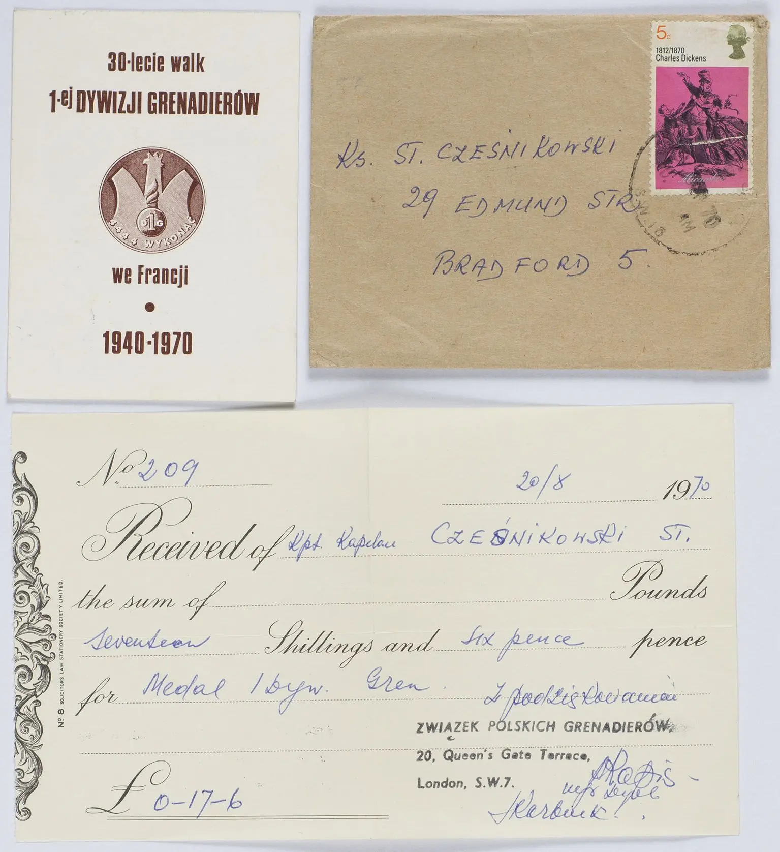 Zestaw dokumentów na nazwisko Stanisław Cześnikowski, - a) Legitymacja uprawniająca do noszenia Medalu pamiątkowego 30-lecia Walk 1-ej Dywizji Grenadierów w Lotaryngii, nr 73, stan bardzo dobry; b) Potwierdzenie wpłaty na Medal pamiątkowy 30-lecia Walk, no 209, 20/8 1970, stan bardzo dobry, wraz z kopertą.
