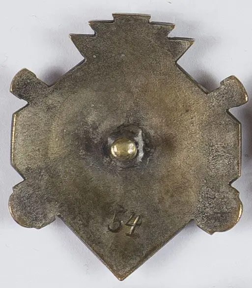 Odznaka 1 Pułk Artylerii Ciężkiej, oficerska, 39 x 35 mm, tombak srebrzony, emalia, rewers gładki, nr 54, słupek, nakrętka sygn. W. Gontarczyk Warszawa Miodowa 19. Stan b. dobry.