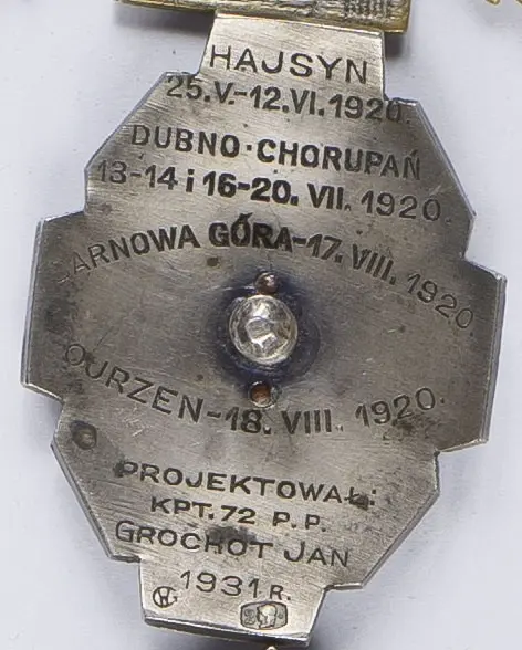 Odznaka 72 Pułku Piechoty - oficerska 42 x 32 mm. Srebro, emalia jednoczęściowa. Rewers gładki, napis "HAJSYN 25.V - 12.VI 1920, Dubno Chorupań 13-14 i 16-20.VII 1920 Sarnowa Góra 17.VIII 1920 Ourzen 18.VIII 1920 Projektował kpt. 72 P.P. Grochot Jan 1931". Cecha srebra "2", imiennik GW, dwa nity mocujące, słupek, nakrętka sygn. W. Gontarczyk, Warszawa, ul. Miodowa nr 19, załączone oryginalne pudełko sygn. W. Gontarczyk. Stan bardzo dobry.