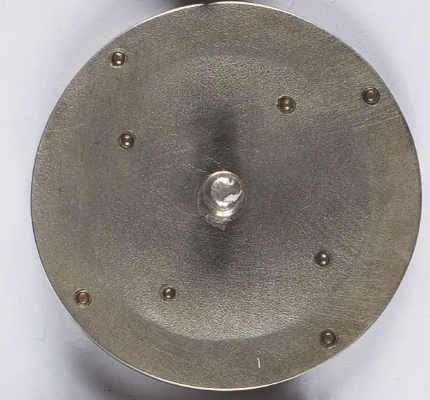 Odznaka 27 Pułku Artylerii Polowej oficerska, średnica 41 mm, biały metal, srebro? emalia, wieloczęściowa, rewers gładki, 8 nitów mocujących, słupek, nakrętka o średnicy 32,5 mm, imiennik GW. Stan bardzo dobry.