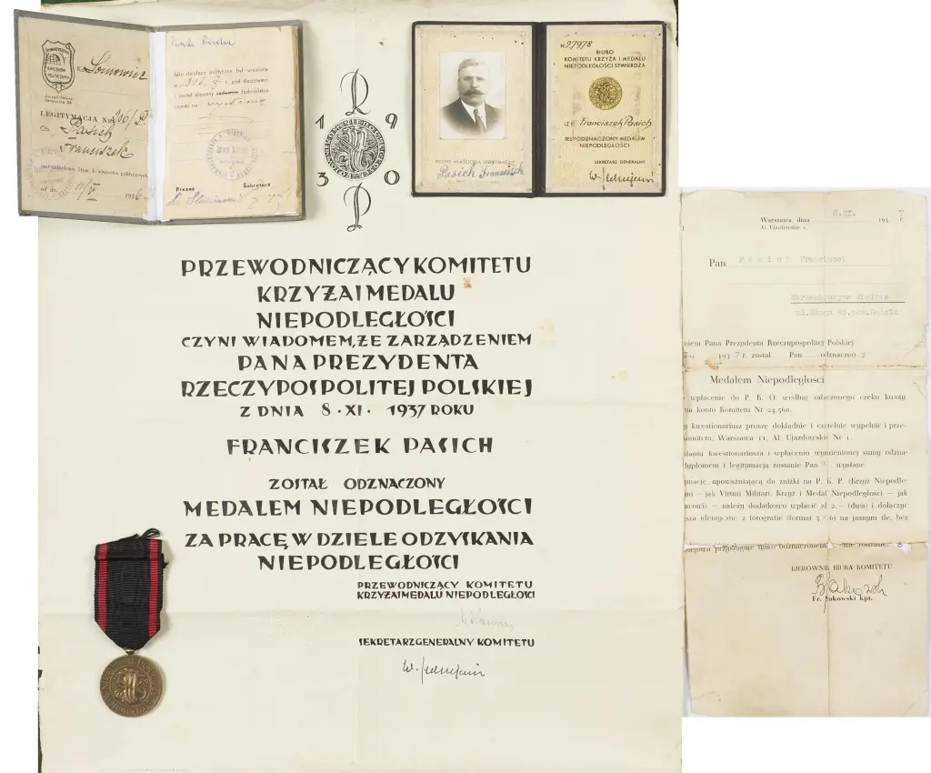 Zestaw: Akt nadania Medalu Niepodległości w oryginalnej tubie, wystawiony na nazwisko Franciszek Pasich. Legitymacja do odznaczenia Medal Niepodległości na nazwisko Pasich Franciszek nr 27978. Dołączona legitymacja Stowarzyszenia Byłych Więźniów Politycznych na nazwisko Pasich Franciszek, nr 206/P, z dnia 11.V.1936. Opłacone składki na lata 1936-1939. Stan: podklejone strony, zniszczenia papieru. W komplecie odznaczenie Medal Niepodległości, zawieszony na oryginalnej wstążce.