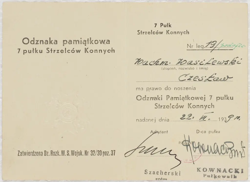 Legitymacja uprawniająca do noszenia odznaczenia pamiątkowego 7. Pułku Strzelców Konnych wydana na nazwisko Czesław Wasilewski, nadana w dniu 22.06.1939, pieczęć tuszowa. Stan dobry.