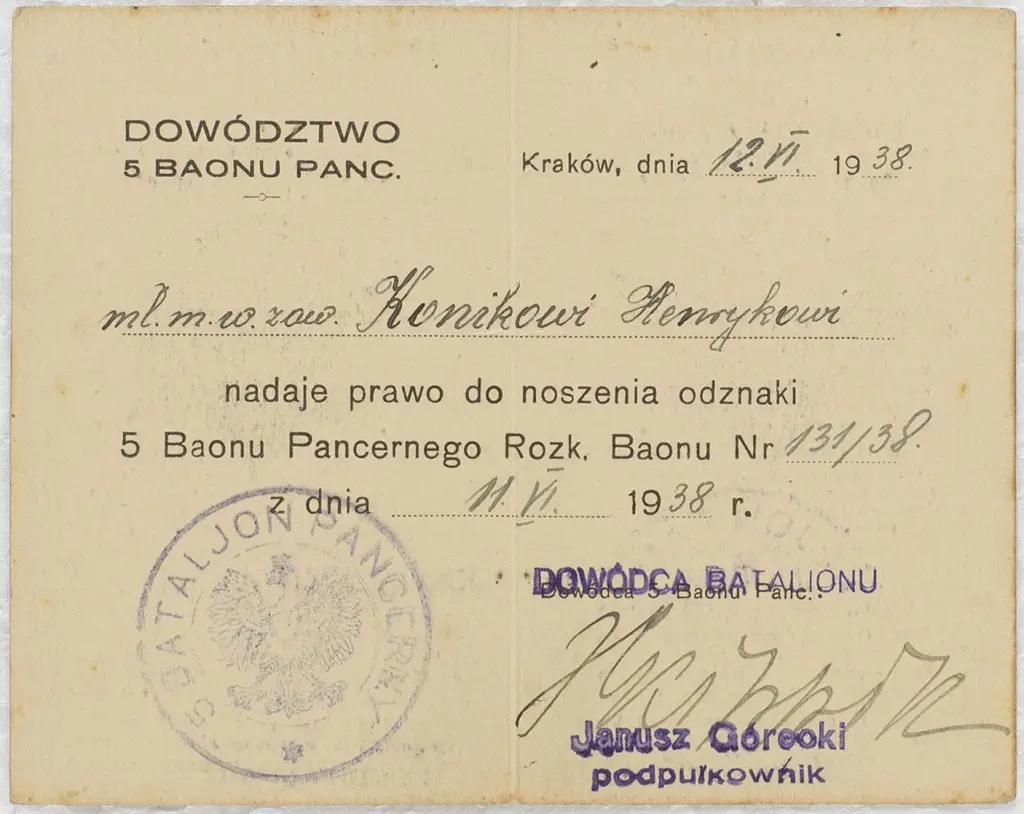 Legitymacja uprawniająca do noszenia Odznaki 5. Baonu Pancernego na nazwisko Henryk Konik nr 68 z dnia 11.06.1938, pieczęć tuszowa. Stan bardzo dobry.