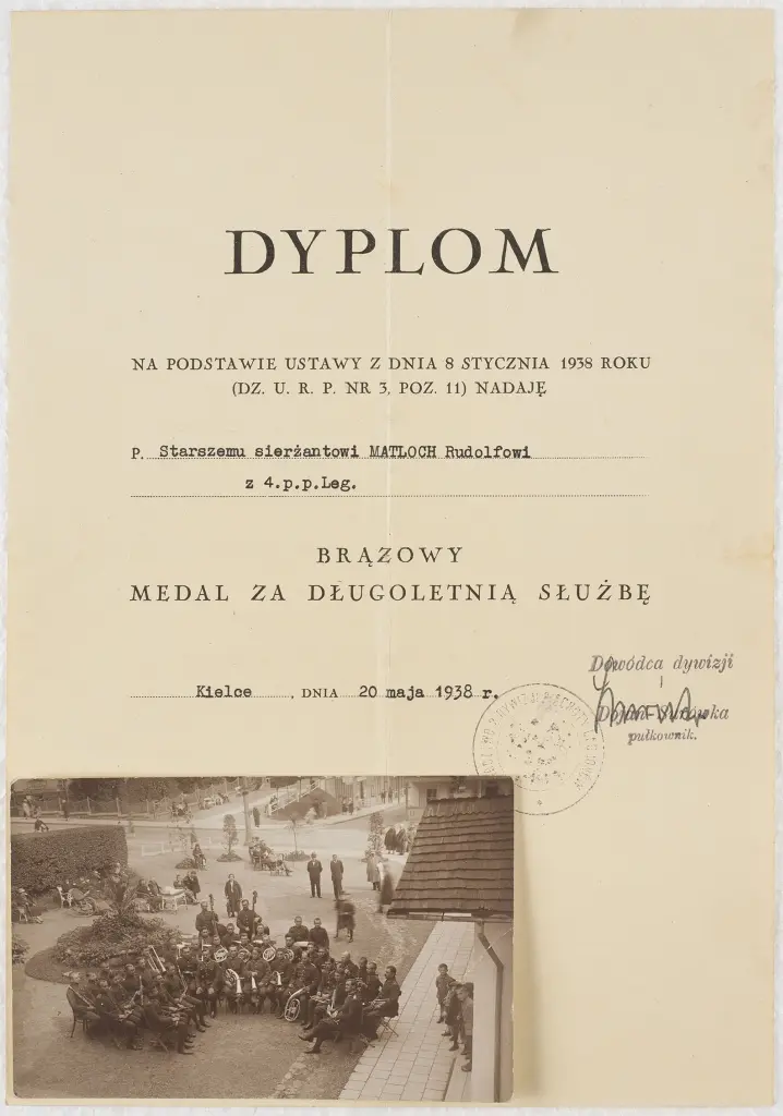 Dyplom Brązowy Medal za Długoletnią Służbę dla starszego sierżanta Matloch Rudolfa z 4 p.p. Leg. Kielce 20 maja 1938 r. oraz zdjęcie orkiestry 4 P.P. Legionów.