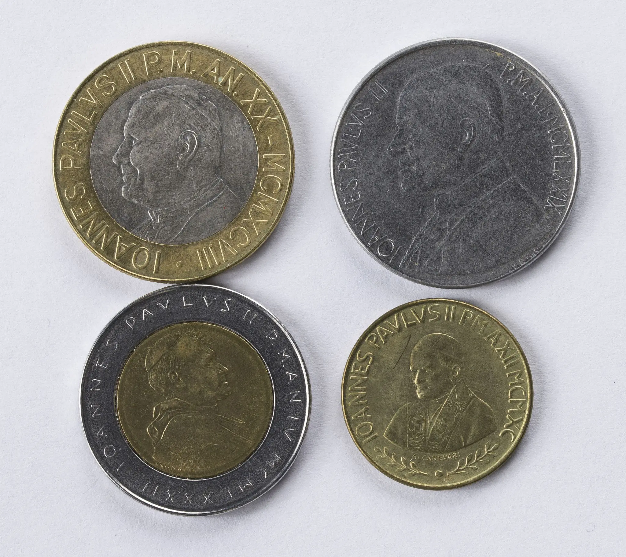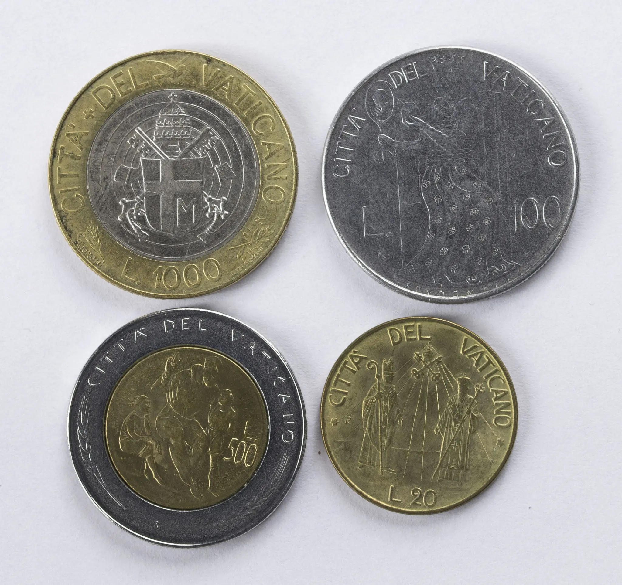 Zestaw monet obiegowych Watykanu - 18 sztuk, w tym: Jan Paweł II -13 sztuk, 5 lirów Piusa XII 1948 rok, Sede Vacante.