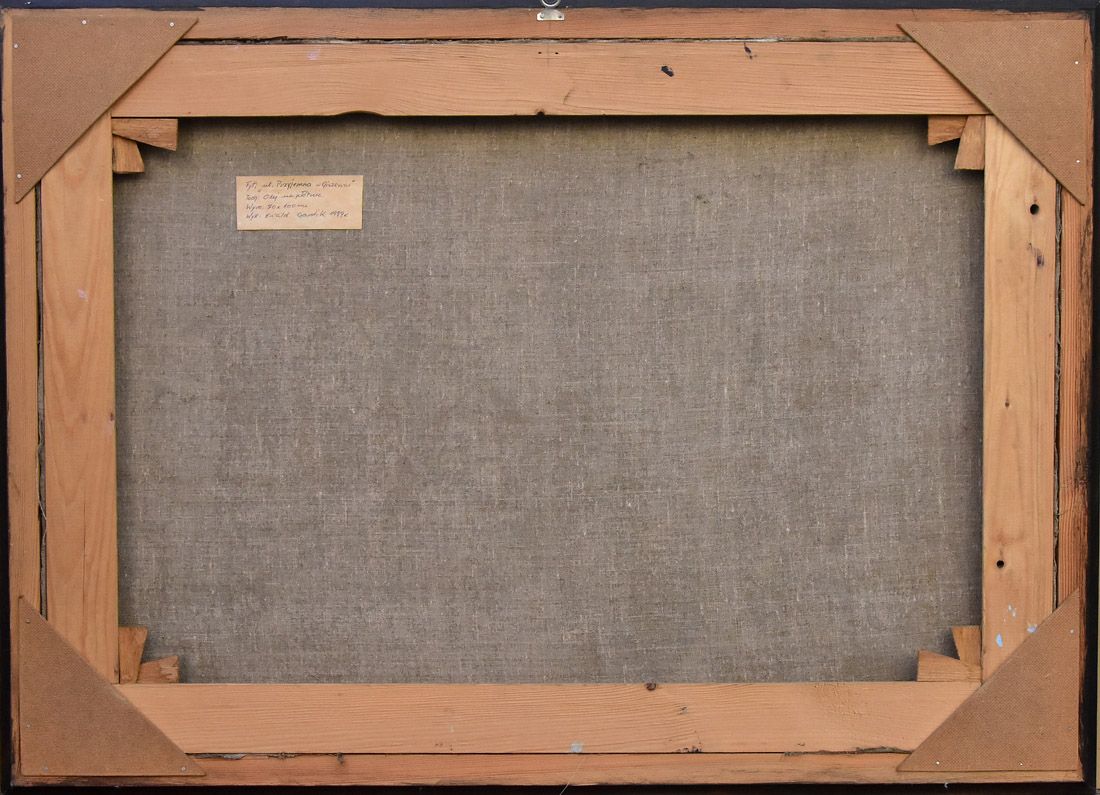 Na odwrocie nalepka z autorskim opisem długopisem: Tyt: "ul. Przyjemna w Giszowcu / Tech: Olej na płótnie. / Wym: 70 x 100 cm / Wyk: Ewald Gawlik 1989.