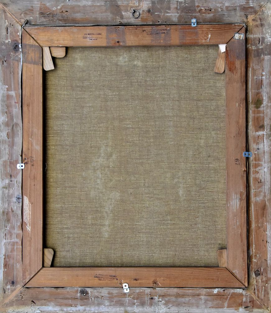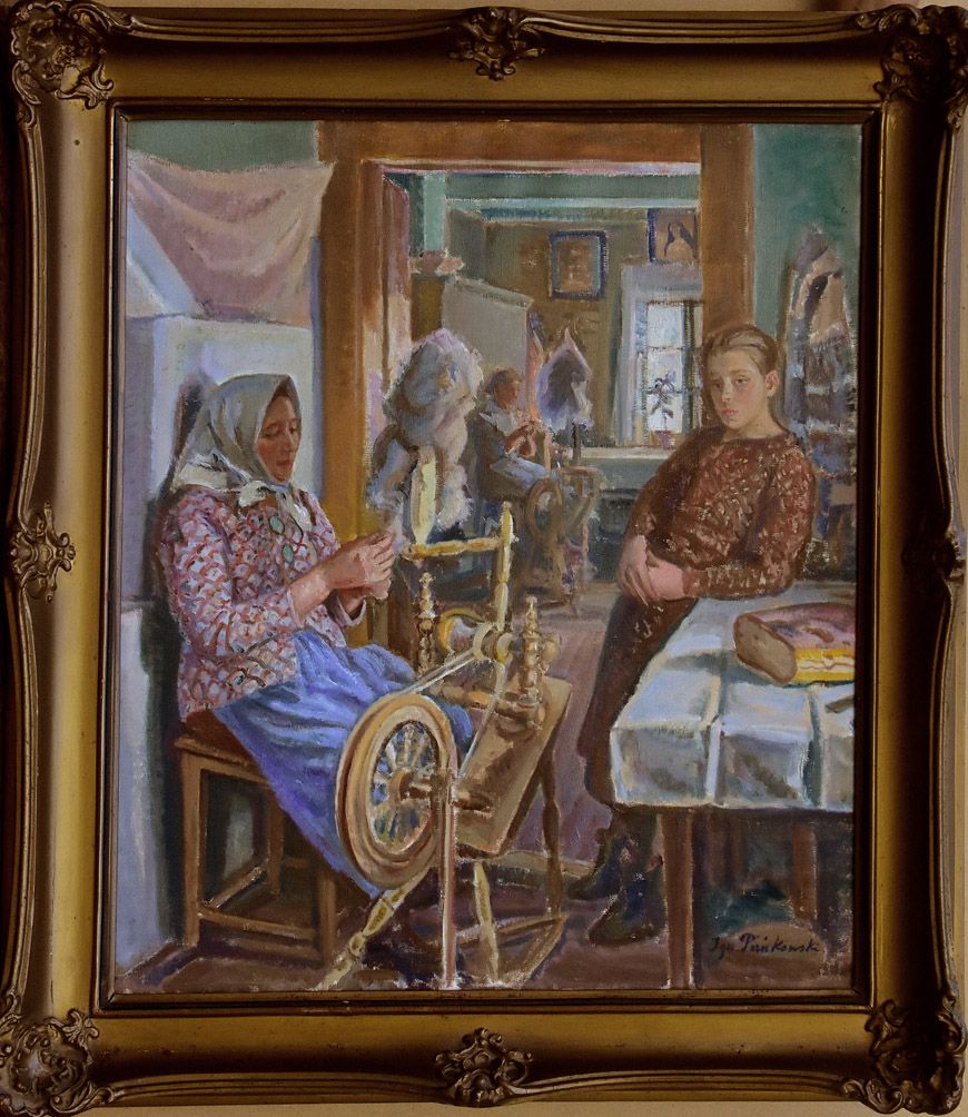 Na krosnach stempel Składu Papieru R. Aleksandrowicz, Kraków, Basztowa 14, oraz stempel Domu Handlowo-Komisowego, obrazy, dywany, antyki itp., Kraków Szpitalna 11 róg św. Tomasza, do obrazu dołączony rachunek zakupu obrazu "Prządki", wystawiony przez Dom Handlowo-Komisowy z Krakowa, z datą 3.5. (19)40.
