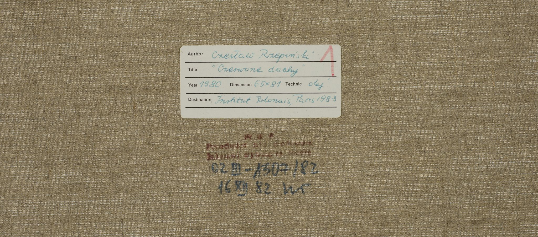 Olej, płótno, 64 x 80 cm, sygn. p.d.: Rzepiński, na odwrocie naklejka z wystawy w Instytucie Polskim w Paryżu z 1983 r. Obraz był reprodukowany w katalogu "Czesław Rzepiński. Malarstwo" wyd. KAW w Krakowie 1986 r., poz. 66 "Czerwone dachy" 1979.