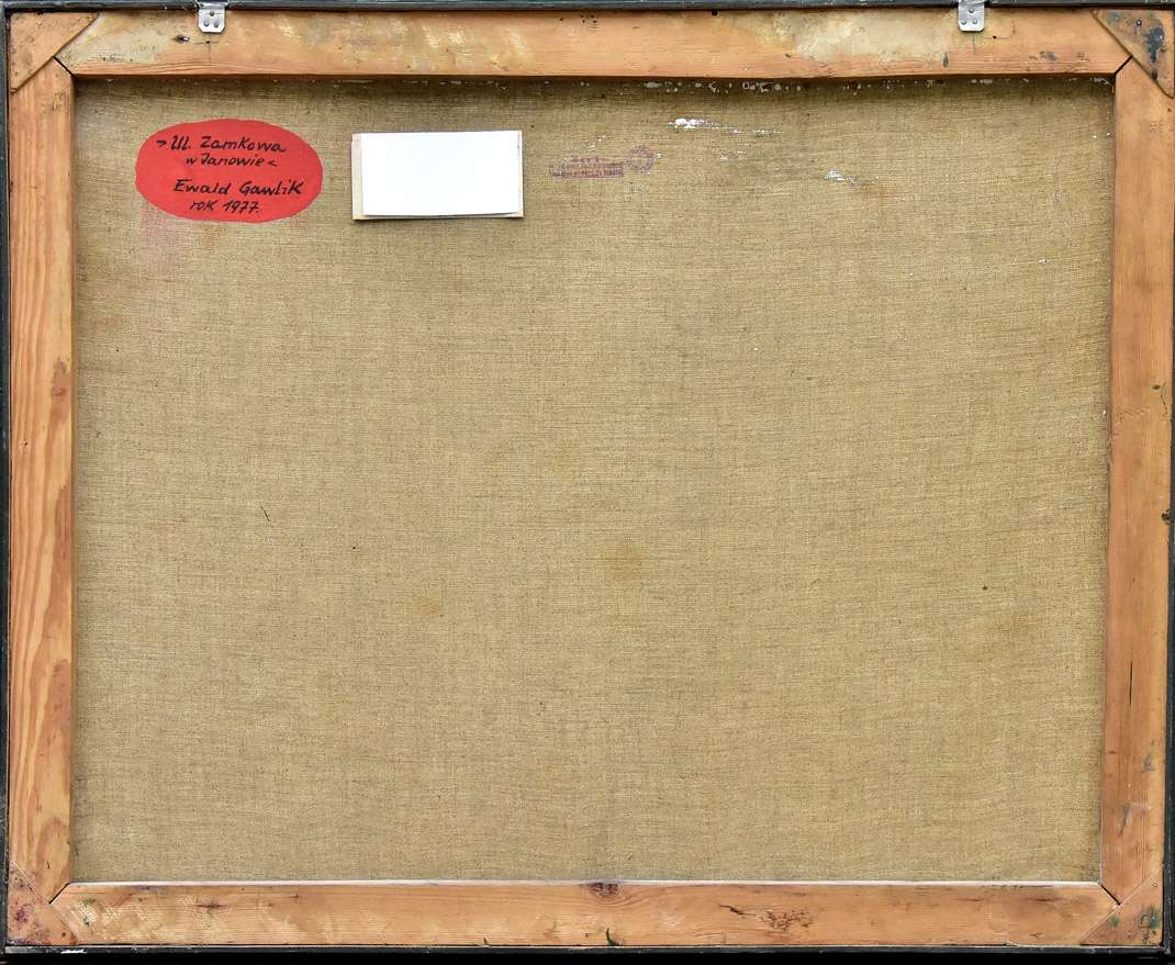Na odwrocie autorski opis: "Ul. Zamkowa / w Janowie / Ewald Gawlik / rok 1977, oraz stemple Urzędu Konserwatorskiego i informacja o wywozie za granicę. Obraz został zakupiony bezpośrednio od Ewalda Gawlika.