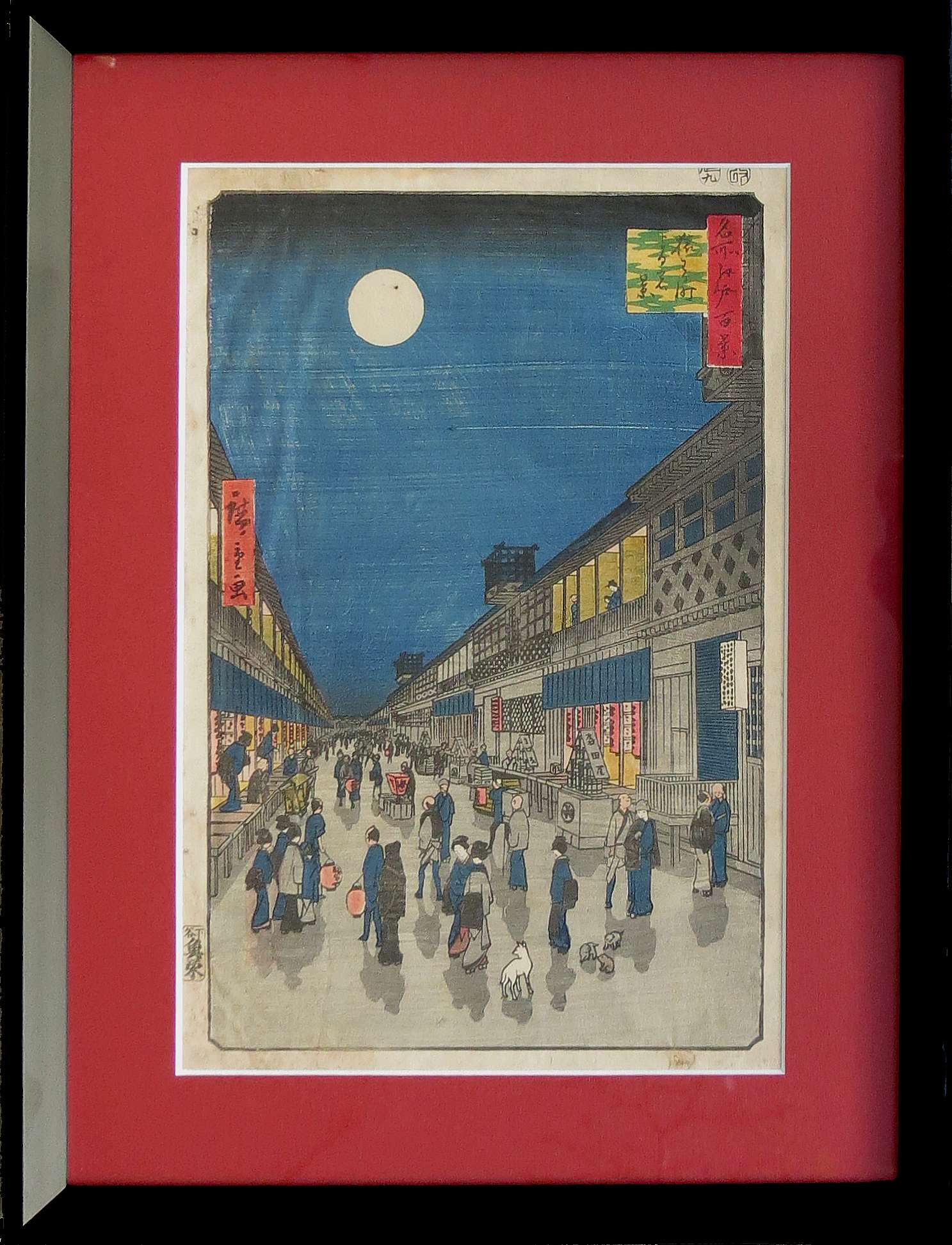 "Plansza ukazuje tłum ludzi na zalanej światłem księżyca ulicy Saruwaka, znajdującej się w dzielnicy teatrów w Edo. (...) Nieruchome postacie zastygłe jakby w swych pozach, tworzą spokojny nastrój sceny. Ulica przedstawiona jest zgodnie z regułami europejskiej perspektywy zbieżnej, odmiennymi od założeń tradycyjnej japońskiej perspektywy równoległej. Kładące się cienie postaci i przedmiotów są innowacją również zaczerpniętą ze sztuki zachodniej. Artysta próbuje wykorzystać efekty, które daje padające światło". (Z. Alberowa, M. Martini, "Hiroshige: wystawa drzeworytów w dwusetną rocznicę urodzin artysty", katalog MN w Krakowie, Centrum Sztuki i Techniki Japońskiej Manggha, Kraków, 1997, s. 169).