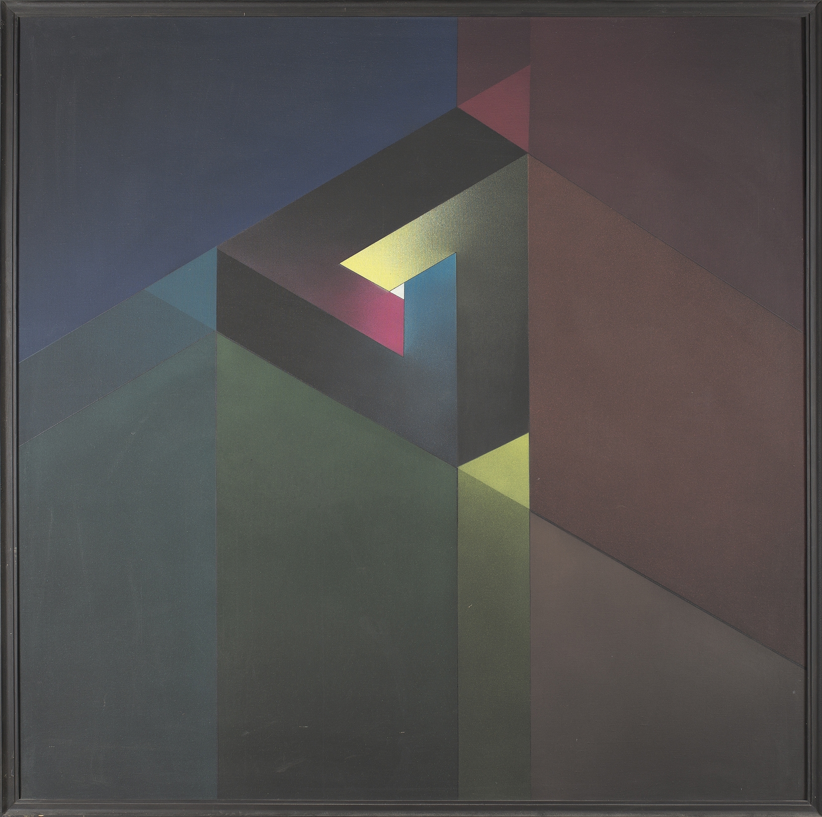 "W każdym poznaniu jest tyle tylko prawdy, ile jest matematyki" głosił Immanuel Kant. Geometria nieeuklidesowa od wieków fascynowała i fascynuje nadal artystów. Interesują ich złudzenia optyczne, które są wywoływane przez "figury niemożliwe". Andrzej Ziębliński również ulega ich przyciąganiu. Na obrazie C89 widzimy tzw.: trójkąt Penrose'a złożony z figur geometrycznych w podstawowych trzech kolorach, które stopniowo ciemnieją. Autor obrazu dokonał transformacji koła barw na przestrzenną figurę niemożliwą - trójkąt.