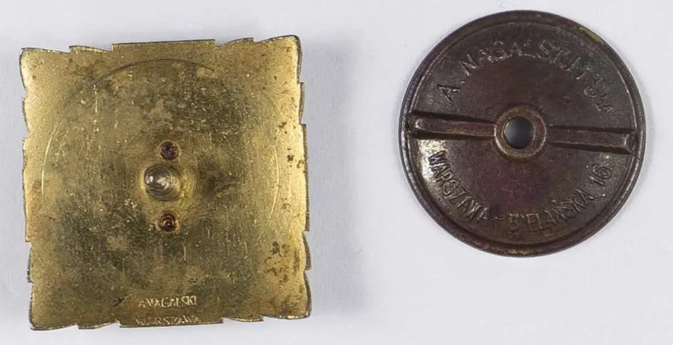 7a Baon Podchorążych Rezerwy Piechoty, 30x30 mm. Tombak złocony i emaliowany. Rewers gładki, złocony, wypukła sygnatura: "A. NAGALSKI WARSZAWA", dwa nity perełkowe mocujące, nakrętka: o średnicy 26 mm o boku gładkim wybrzuszonym dobrze przemieszczająca się po słupku sygnowana "A. Nagalski Warszawa-Bielańska 16". Stan bardzo dobry.