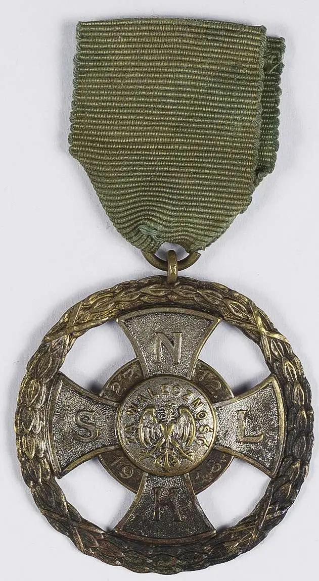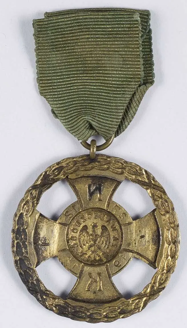 Odznaka Naczelnej Komendy Straży Ludowej Pamiątkowy Krzyż "Za Waleczność" NKSL 1920, średnica 45 mm. Mosiądz złocony i srebrzony. Rewers z kontrą, złocony. Odznaka ma kształt wpisanego w otok w formie wieńca laurowego krzyża równoramiennego o rozszerzających się wypukłych krawędziach, na których wpisano litery "NKSL" (oznaczające: Naczelny Komitet Straży Ludowej), pośrodku medalion na nim orzeł nawiązujący do orłów jagiellońskich, nad orłem napis: "WALECZNOŚĆ", boczne krawędzie ramion łączy płaski półkolisty otok z datą: "27.12.1918.", obydwa otoki w mosiądzu złoconym, krzyż i medalion mosiądz srebrzony, kółeczko do mocowania wstążki w odcieniu zielonym. NIEZWYKLE RZADKA. Stan odznaki dobry.