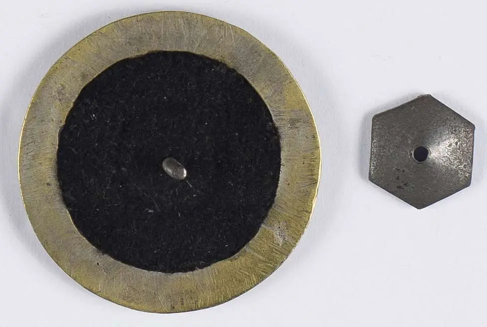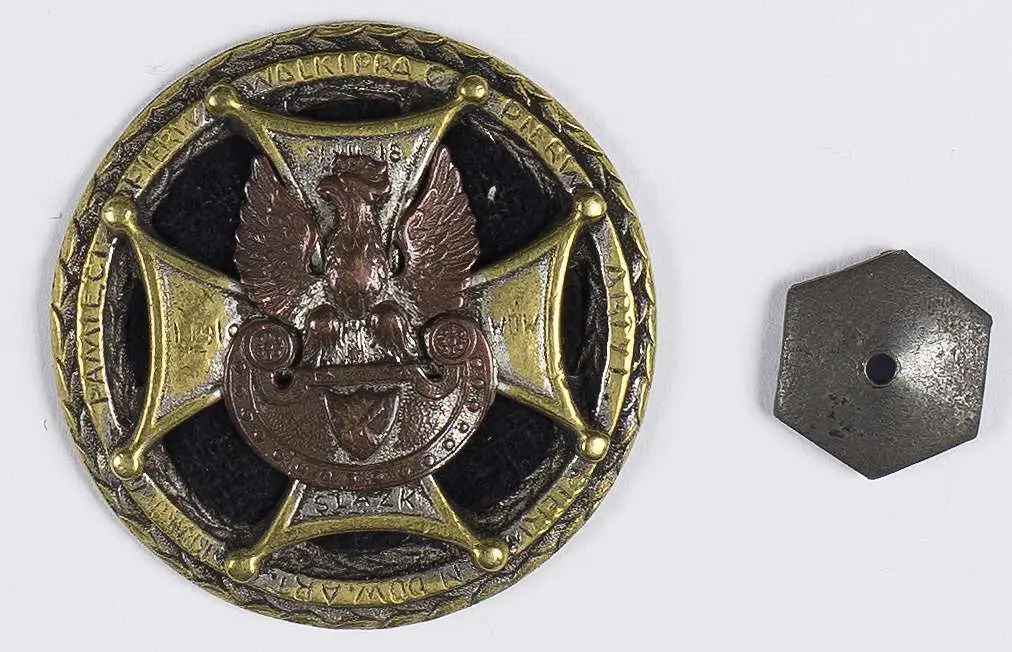 Odznaka pamiątkowa Dowództwa Artylerii Kraków, średnica 45 mm, mosiądz i brąz, dwuczęściowa, słupek, nakrętka sześcioboczna z ciemniejszego metalu, podkładka z czarnego sukna. Sygnowana N. WALDYN. Stan bardzo dobry.