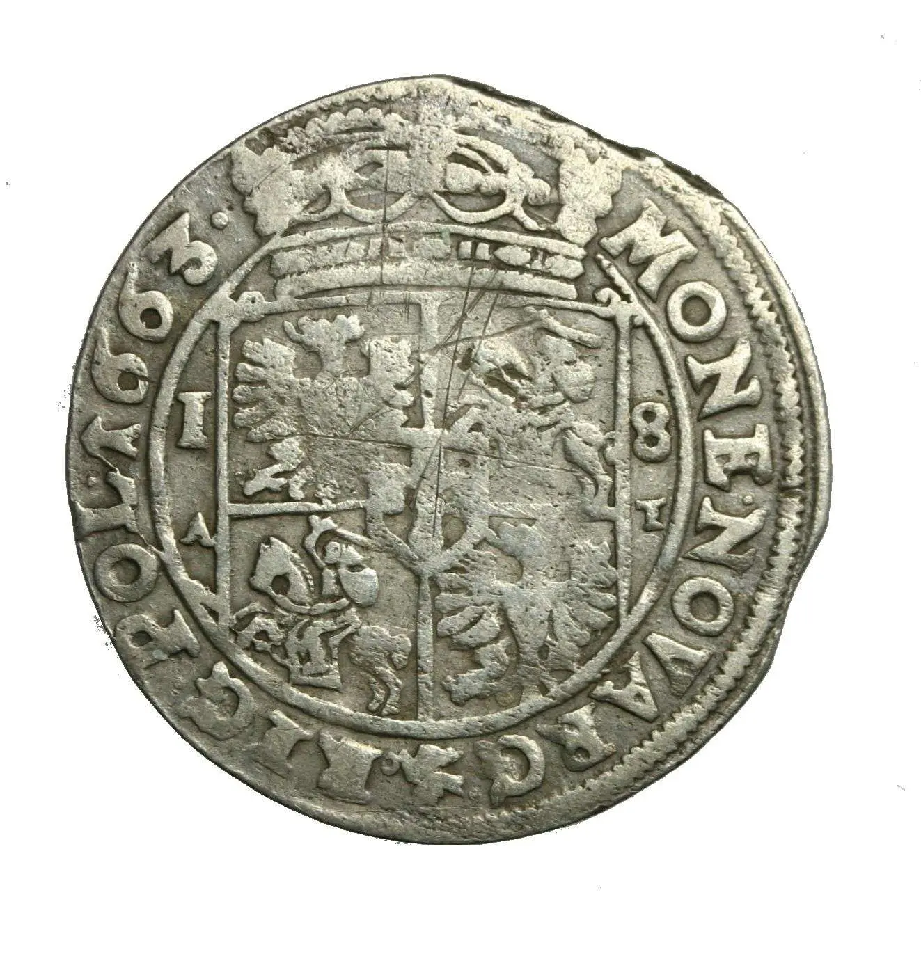 Jan Kazimierz (1648-1668), ort koronny 1663 1-8 A-T ślepowron stan III, patyna,Kop.1770
