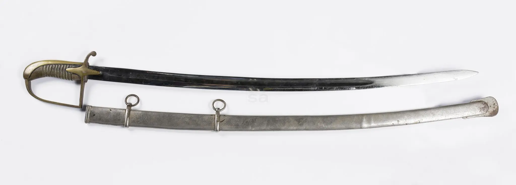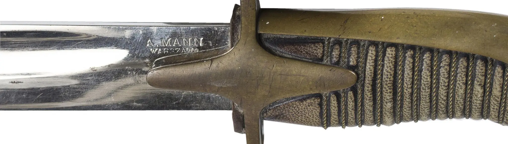 Szabla oficerska wz. 21/22, kabłąk oraz kapturek mosiężne, trzon rękojeści drewniany obciągnięty skórą. Głownia stalowa niklowana z jedną bruzdą u nasady sygnowana "A. Mann Warszawa". Pochwa stalowa. Stan dobry - wytarcie skóry na rękojeści, minimalne "użytkowe" uszkodzenia pochwy, ostrodze niewielka korozja, brak śrubki trzymającej dławik. Wymiary: długość całkowita szabli: 96 cm, długość głowni: 80 cm, szerokość głowni: 3 cm, grubość głowni u nasady: 0,5 cm, długość rękojeści: 15,5 cm, długość pochwy: 83 cm.