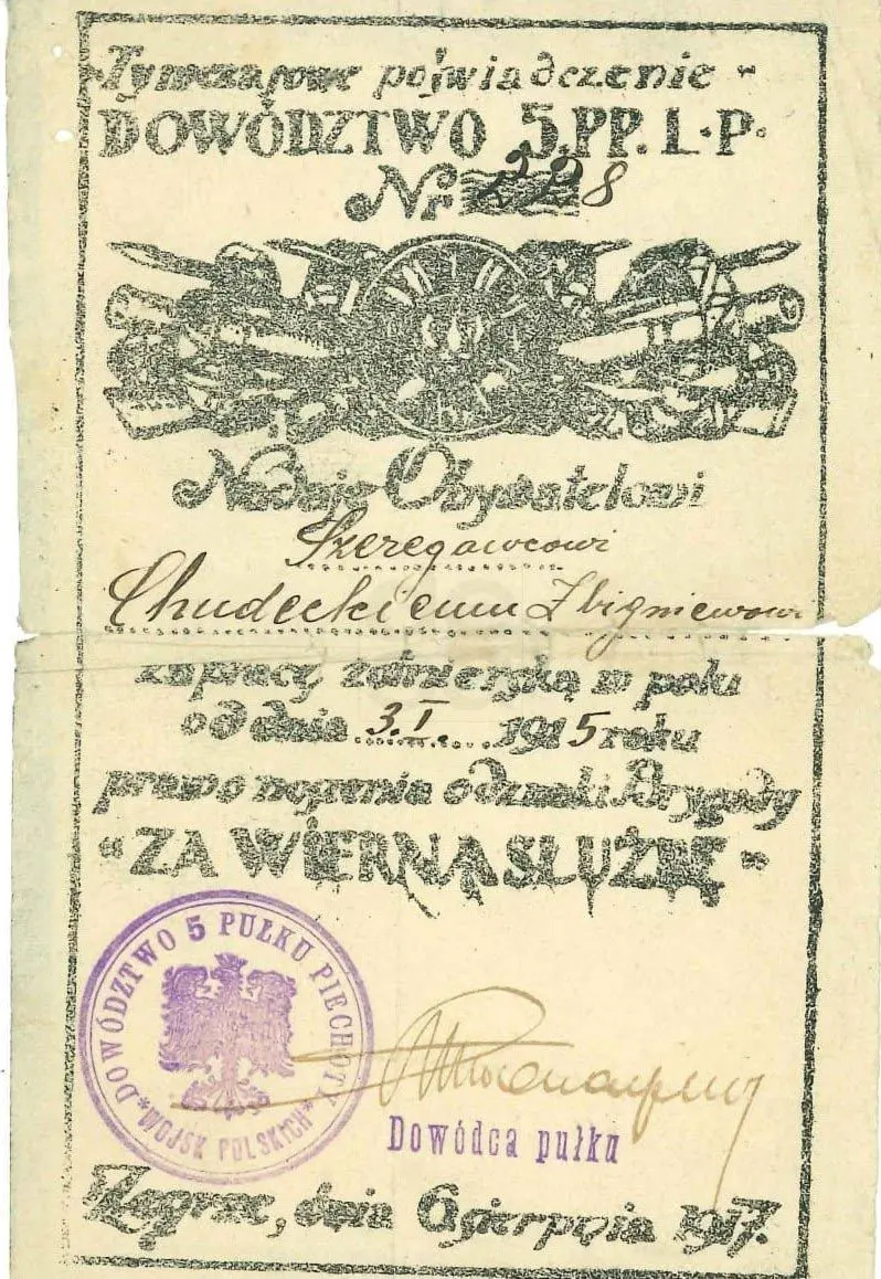 Tymczasowe poświadczenie nadania prawa do noszenia odznaki Brygady "Za wierną służbę", wystawione przez dowództwo 5 Pułku Piechoty Legionów. Nadana szeregowcowi Chudeckiemu Zbigniewowi za pracę żołnierską od dnia 3.I. 1915. Nadane dnia 6 sierpnia 1917 przez Dowódcę pułku. 15x9,5 cm. Przetarcia i zagięcia papieru.