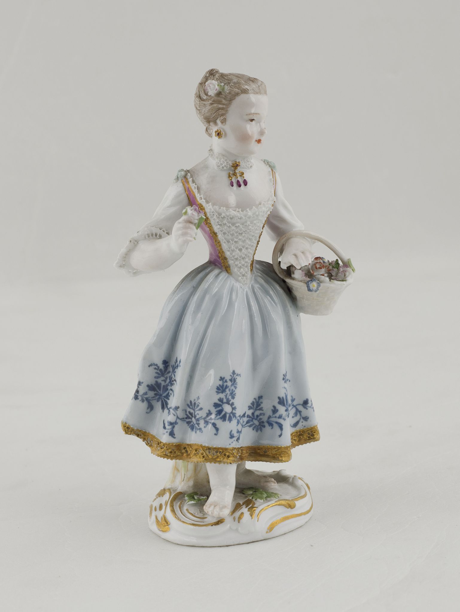 Z koszykiem kwiatów, figurka porcelanowa, malowana, złocona,