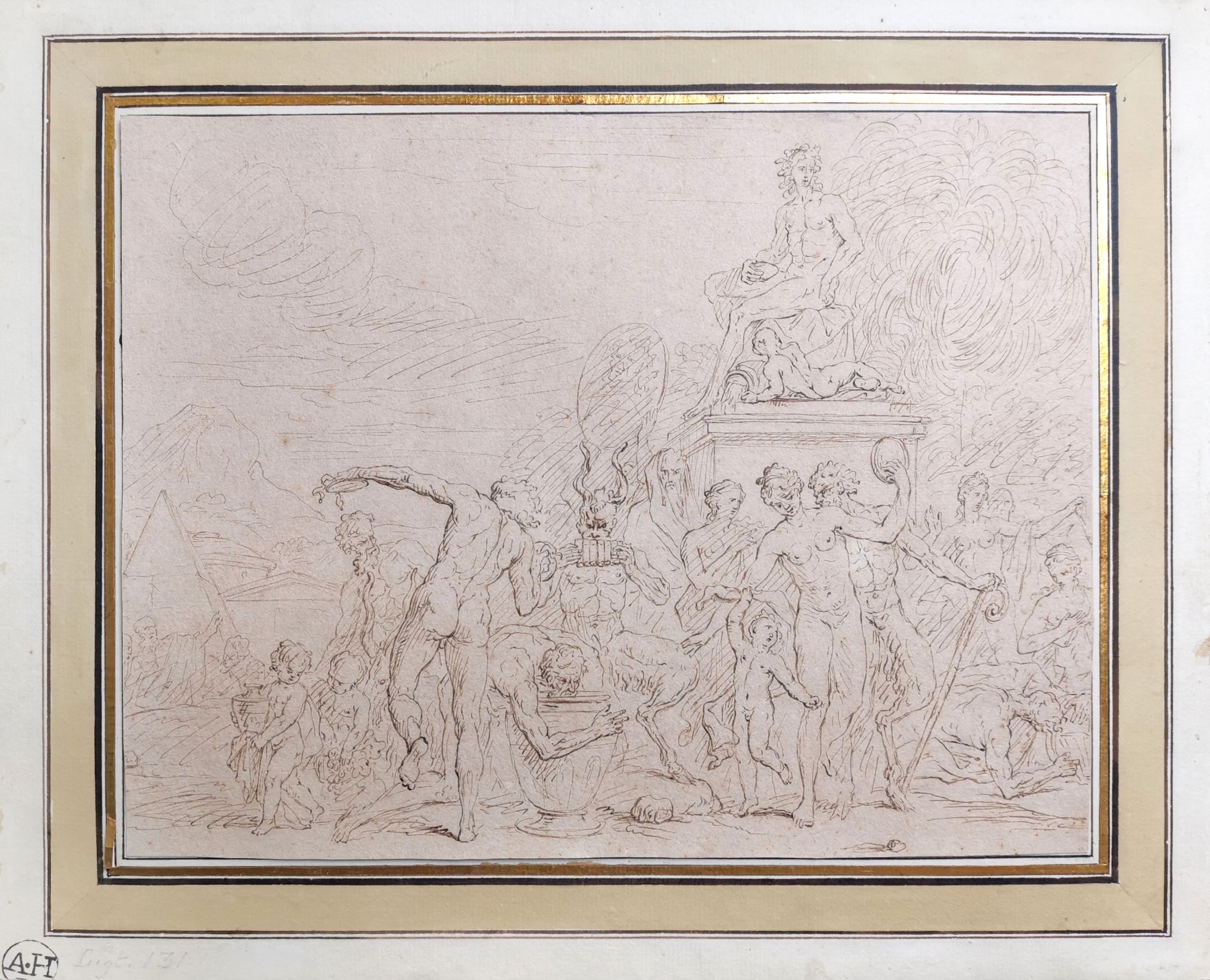 Pióro w tonie brązowym, papier żeberkowy. Wym. 24 x 31 cm. Niesygn., naklejony na tekturę z częściowo zachowaną pieczęcią A.H. ...(?), ołówkiem: Lugt 131, z tyłu: śr. g. nieczytelnie tuszem, l.d. nieczytelnie ołówkiem, p-śr.d. ołówkiem: Lafage. Niewielkie naddarcie śr.d.
