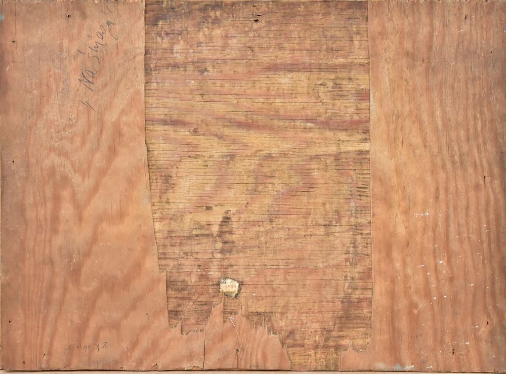 olej, karton naklejony na sklejkę, 35 x 50 cm, niesygnowany, na odwrocie opis ołówkiem: Wróbel / "Na śniegu".