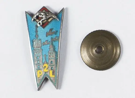Miniatura odznaki 2 Pułk Lotniczy, 25 x 11 mm. Wykonana w srebrze, emaliowana, wieloczęściowa - orzeł nakładany i mocowany na dwa nity. Rewers gładki, próba srebra (2 główka) oraz imiennik grawera JK - Jan Knedler. Mocowana na słupek z niesygnowaną nakrętką o średnicy 12 mm. Stan zbliżony do idealnego.