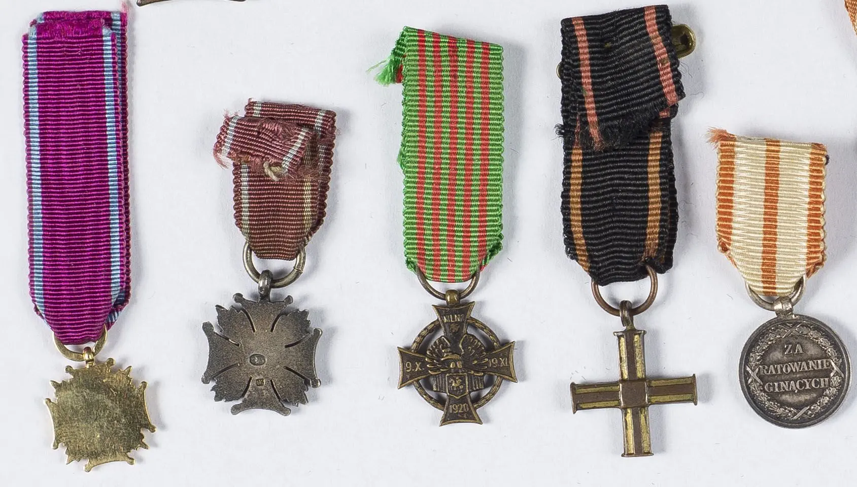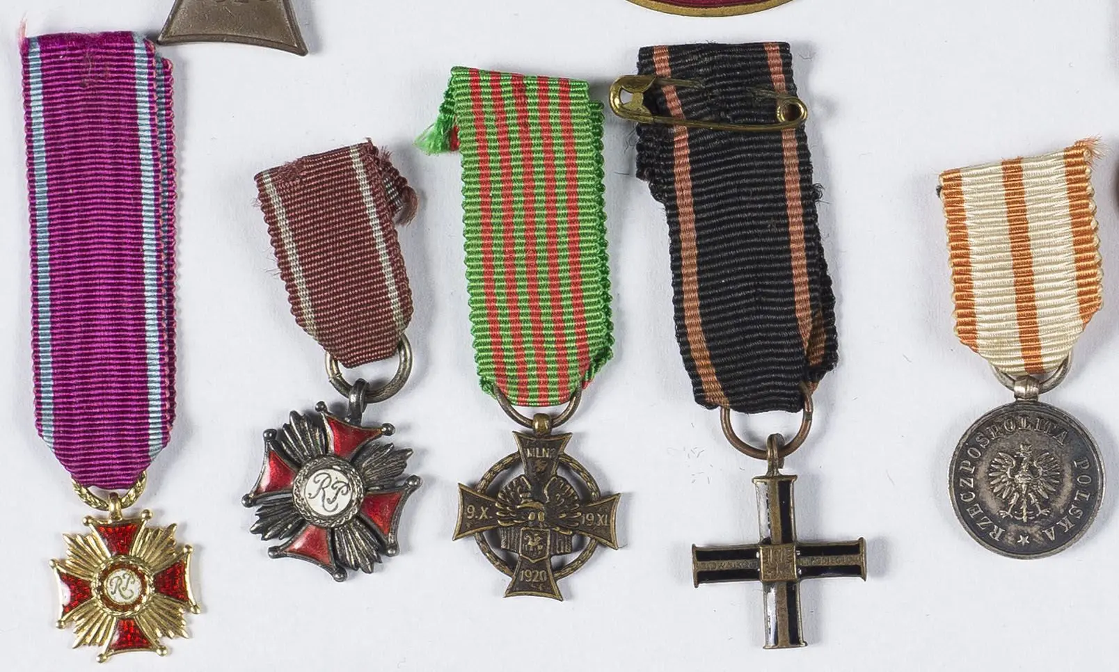 Zestaw 5 miniatur odznaczeń. 1. Krzyż Niepodległości - 16 x 21 mm, wykonany w brązie, emaliowany, zawieszony na oryginalnej wstążce. 2. Krzyż Zasługi Wojsk Litwy Środkowej, 16 x 18 mm, wykonany w brązie, zawieszony na oryginalnej wstążce. 3. Medal za Ratowanie Ginących, średnica 15mm, wykonany w srebrze, zawieszony na oryginalnej wstążce. 4. Srebrny Krzyż Zasługi, 16 x 19 mm, wykonany w srebrze, emaliowany, na rewersie próba srebra (2 główka) oraz imiennik JK - Jan Knedler. 5 Złoty Krzyż Zasługi, 14 x 16 mm. Wykonany w złocie (?) emaliowany, zawieszony na oryginalnej wstążce.