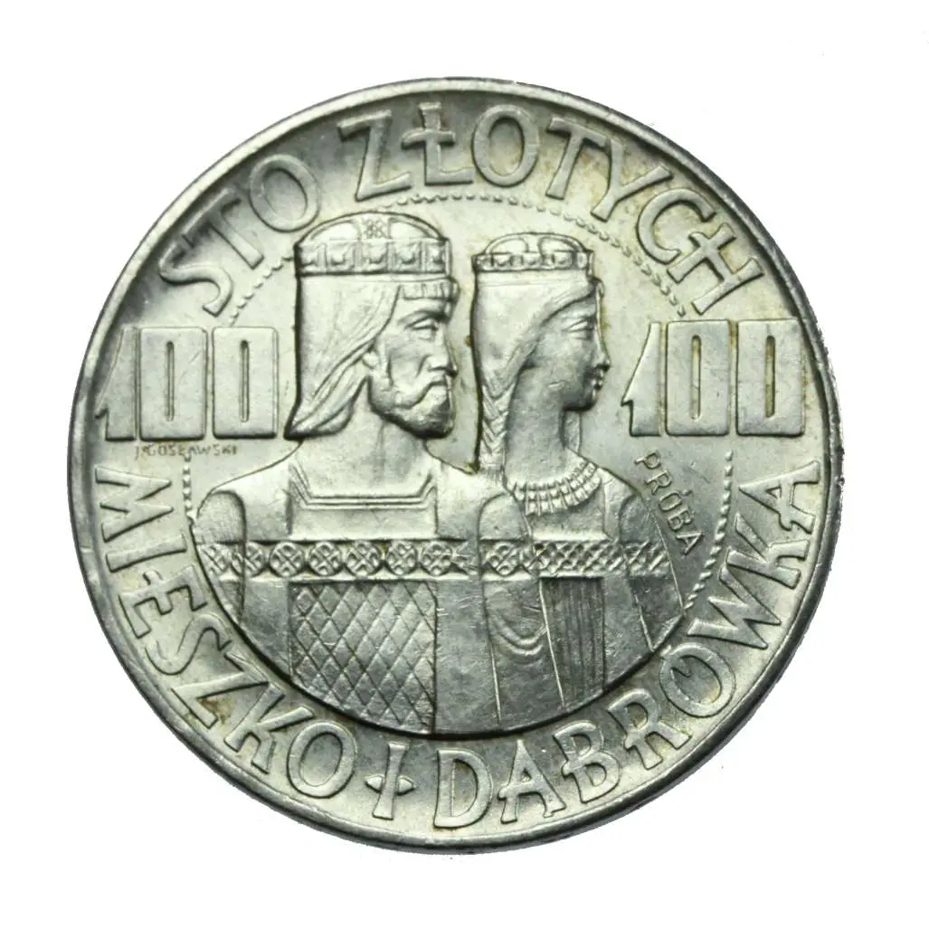 PRL, EMISJA 1966, 100 ZŁ MIESZKO I DĄBRÓWKA, próba, stan I -; AG 900, moneta okolicznościowa wybita z okazji 1000 - lecia państwa polskiego; stan I -, z delikatnym połyskiem, jak na zdjęciu