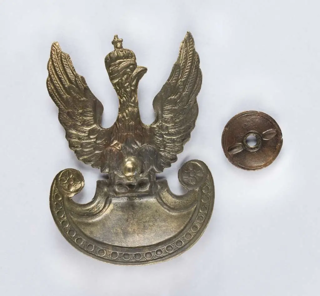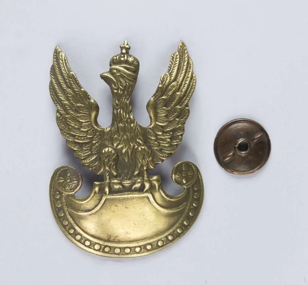 Orzeł wz. 19; 60x40mm. Wykonany w mosiądzu. Rewers z kontrą. Mocowany na słupek z niesygnowaną nakrętką o średnicy 16mm. Stan bardzo dobry.