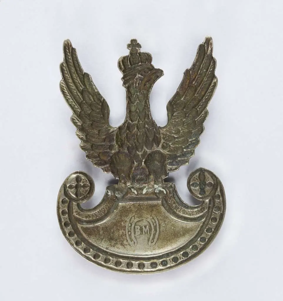 Orzeł wz. 19; 43x60mm. Wykonany w białym metalu. Rewers z kontrą, na rewersie tarczy amazonek wypukła sygnatura "B. M" oraz podkowa. Brak mocowania. Analogiczny orzeł publikowany jest w książce Tomasza Zawistowskiego, Polskie orły do czapek w latach 1919-1939, str. 53, il. 75. Stan bardzo dobry.