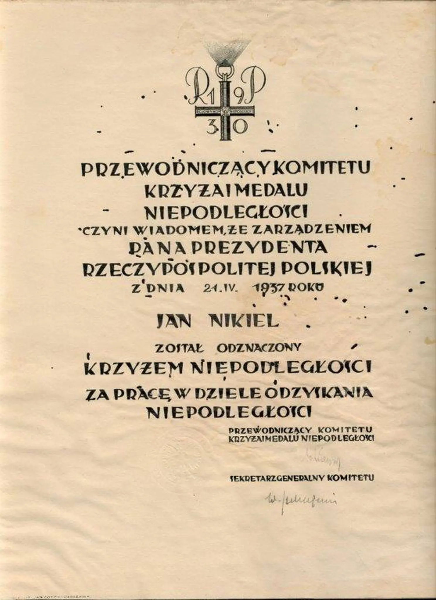 Dyplom nadania Krzyża Niepodległości zarządzeniem Prezydenta Rzeczpospolitej z dnia 21 kwietnia 1937 r. za pracę w dziele odzyskania niepodległości dla Jana Nikiela