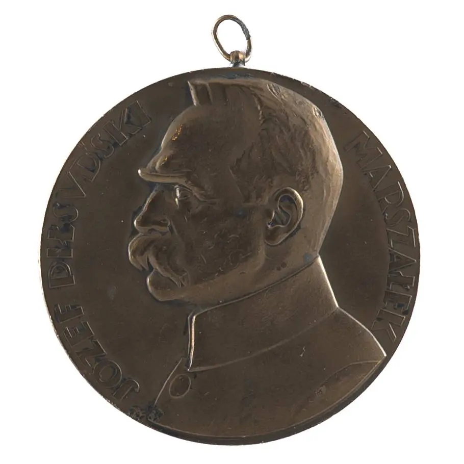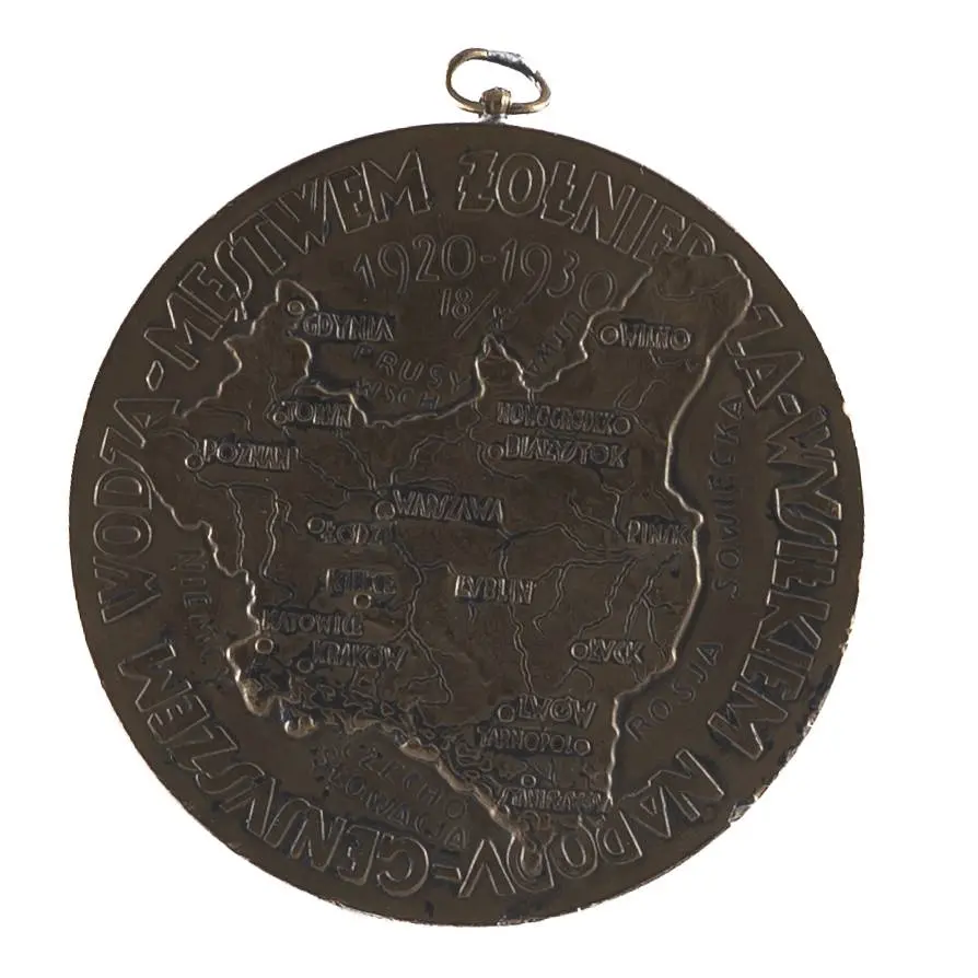 średnica 55 mm, brąz. Awers: Popiersie w lewo. W otoku: MARSZAŁEK JÓZEF PIŁSUDSKI. Rewers: Mapa terytorium Polski. W otoku: MĘSTWEM ŻOŁNIERZA - WYSIŁKIEM NARODU - GENIUSZEM WODZA. Na górze: 1920-1930 18/X Medal autorstwa Józefa Aumillera. Okrągła lekko wygięta zawieszka. Wyszczerbienia na krawędziach. Stan dobry.