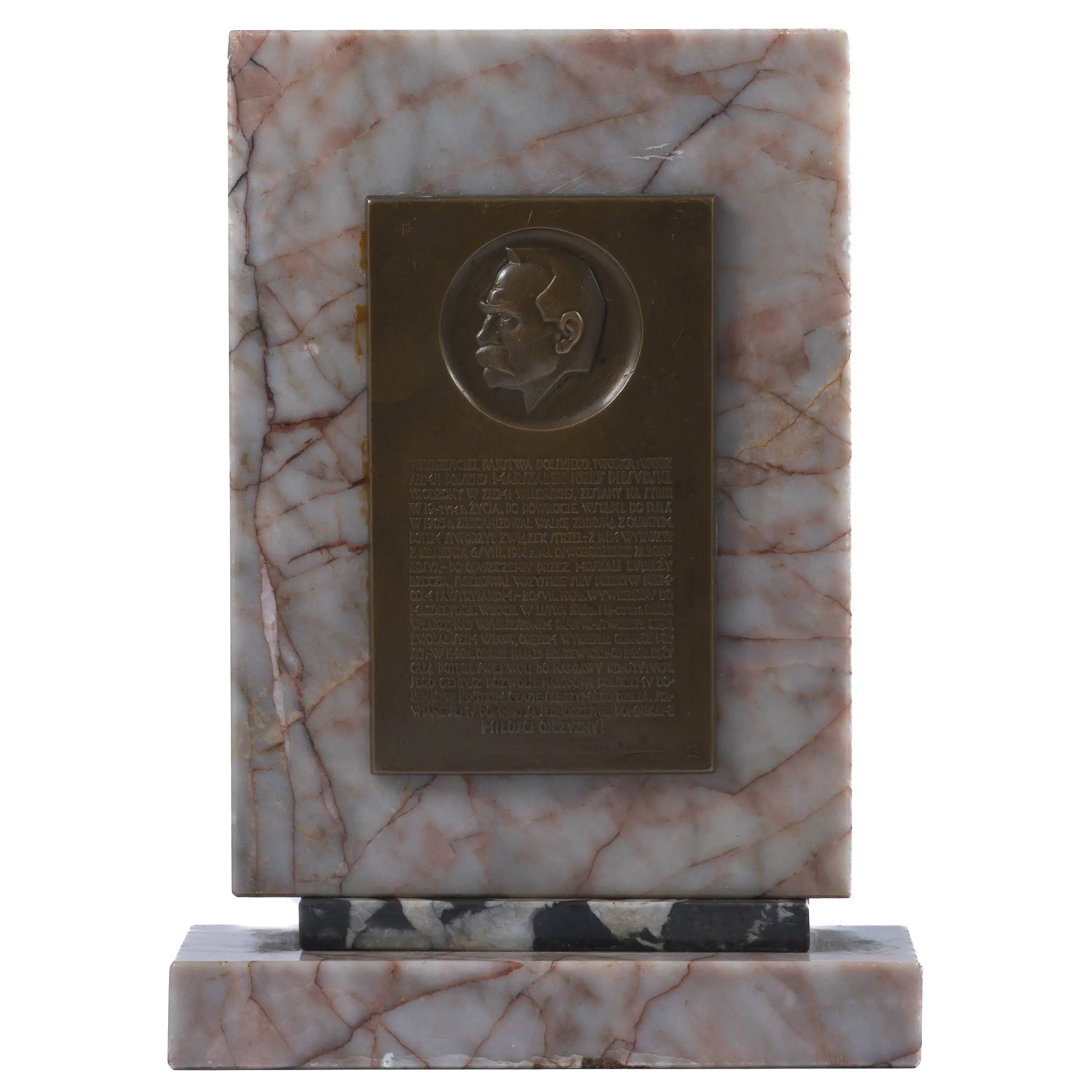 Postument granitowy: 13,2 x 5,3 x 18 cm. Połączenie dwóch kolorów kamienia. Plakieta autorstwa Józefa Aumillera, 10,3 x 6,3 cm, brąz. Forma prostokątna, w części górnej kolisty medalion z głową Józefa Piłsudskiego w lewym profilu, poniżej 18 wierszy tekstu: WSKRZESICIEL PAŃSTWA POLSKIEGO, TWÓRCA I WÓDZ / ARMII POLSKIEJ MARSZAŁEK JÓZEF PIŁSUDSKI URODZONY W ZIEMI WILEŃSKIEJ...; autorstwa Wacława Sieroszewskiego. U dołu z prawej faksymile podpisu Wacława Sieroszewskiego, oraz herb Kościesza - znak Mennicy Państwowej, u dołu z lewej sygnatura: J. Aumiller. Plakieta ze śladami niewielkich wgłębień na powierzchni. Niewielkie uszczerbienie lewego górnego rogu postumentu.