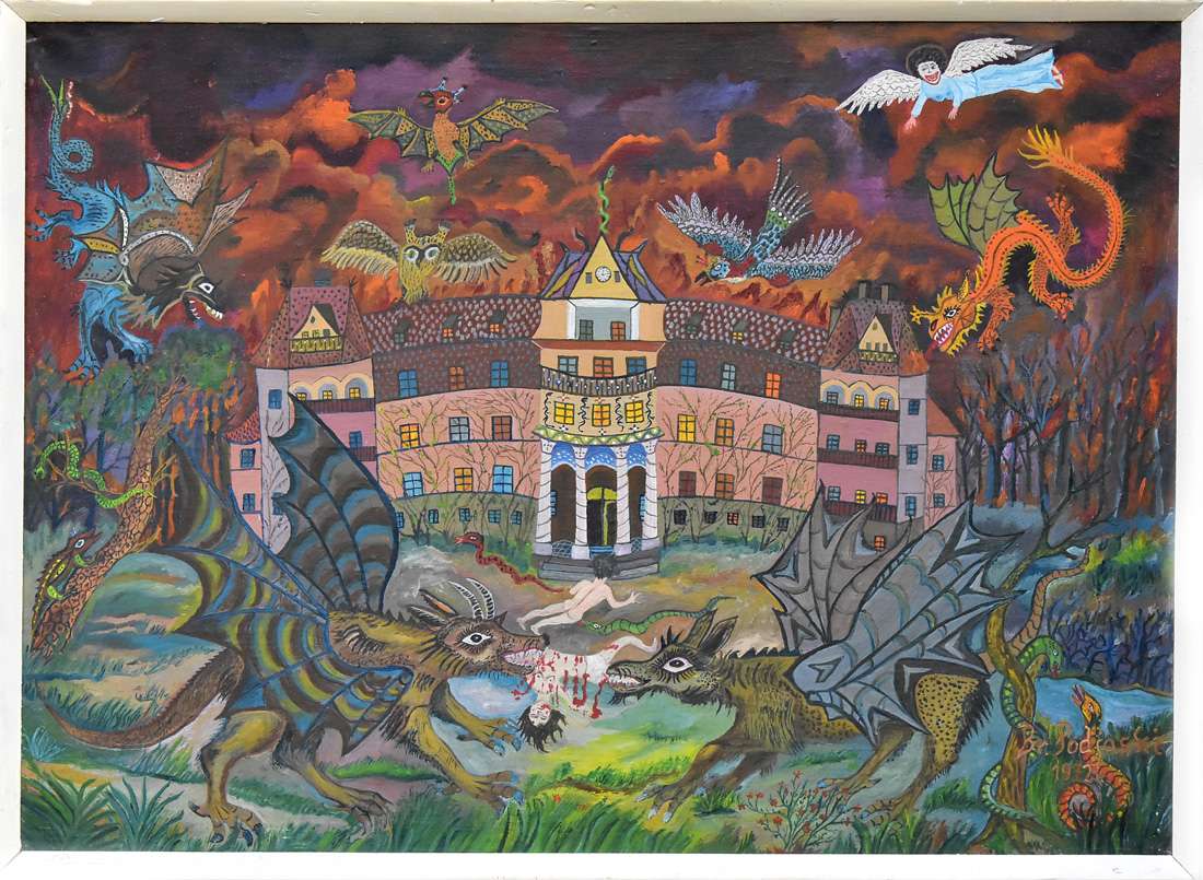 Prezentowany obraz o tytule "Monster-Invasion in Bucovice (!)" reprodukowany w: "Die Sammlung Marianne Kühn - Naive Kunst", katalog Vestisches Museum Recklinghausen, 2003, il. MK 115, s. 259.
