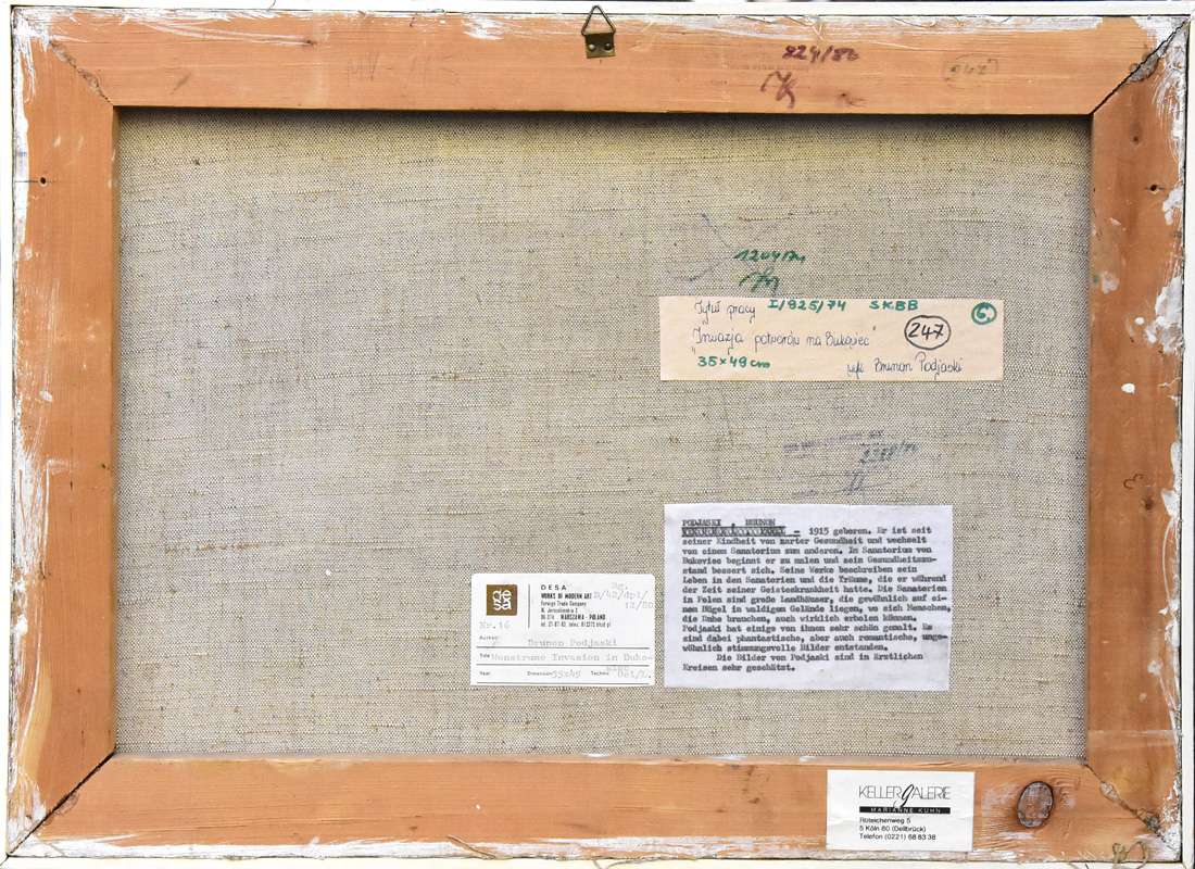olej, płótno, 36,5 x 50 cm, sygn. p.d.: Br. Podjaski / 1972 r. Na odwrocie drukowana nalepka: Keller Galerie / Marianne Kühn / Roteichenweg 5 / 5 Köln 80 (Dellbrück) / Telefon (0221) 68 83 38; drukowana nalepka: DESA Works of Modern Art. Foreign Trade Company / Al. Jerozolimskie 2 / 00-374 Warszawa - Poland, z tekstem maszynowym; stemple DESA z informacją o wywozie za granicę z lat 1974 i 1980. Nalepka z biografią artysty w języku niemieckim.