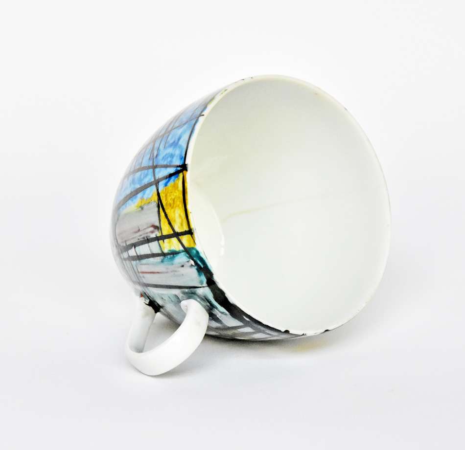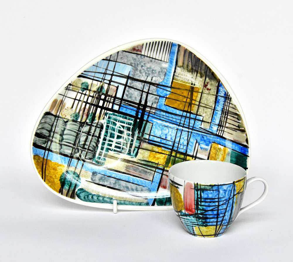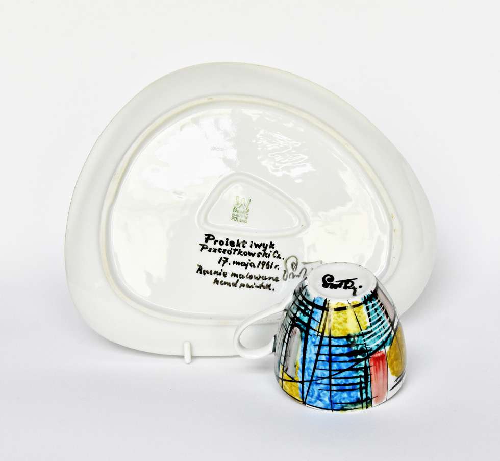 porcelana, farby naszkliwne, filiżanka wys. 6 cm, spodek o formie trójkąta o zaokrąglonych narożnikach, wym.: 23 x 18 cm, projekt dekoracji i wykonanie: Czesław Pszczółkowski, 1961, znak drukowany zielony ZPS "Krzysztof" w Wałbrzychu z lat 1952-1997, napis czarną farbą: Projekt i wykonanie / Pszczółkowski Cz. / 17. maja 1961 r. / Ręcznie malowane / hand painted / (sygnatura autora). Stan zachowania: filiżanka pęknięta.