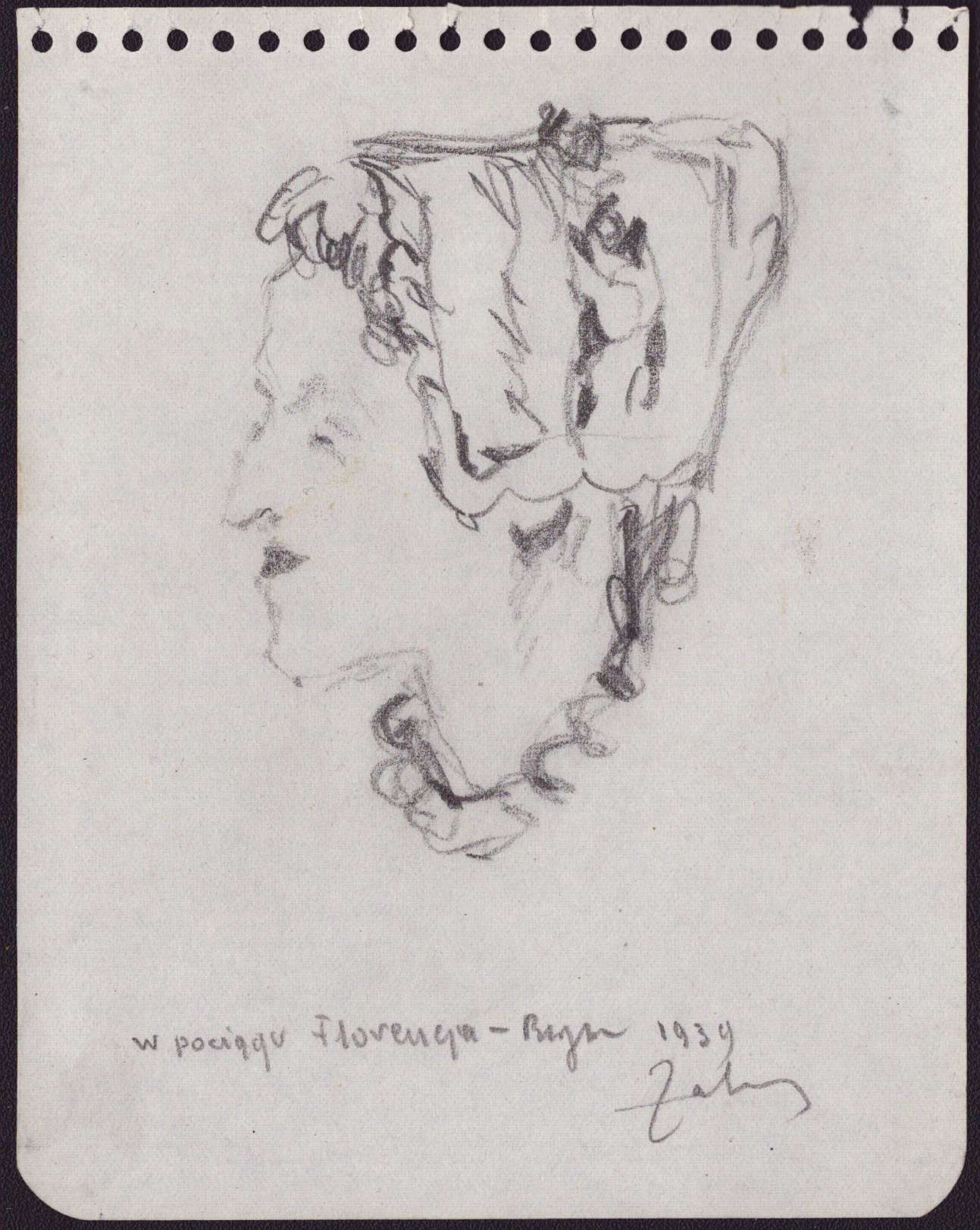 Ołówek, papier, 12,5 x 9, 5 cm w świetle p-p., sygn. d.: w pociągu Florencja-Rzym 1939 Zakrz.