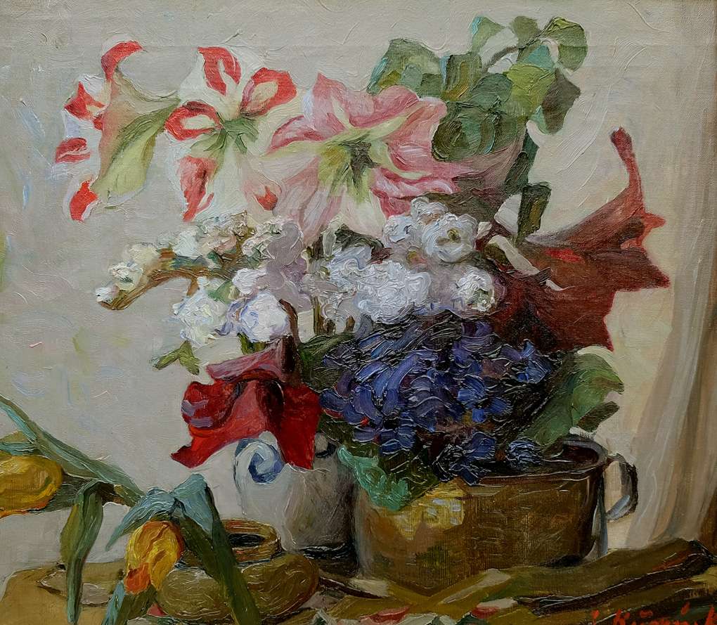 olej, płótno, 54 x 61,5 cm, sygn. p.d.: I. Kuczyńska. Na odwrocie na krosnach sygnatura ołówkiem: Ilka Kuczyńska oraz nalepka z tekstem maszynowym: Ilka Kuczynska, VII., Neubaugürtel No. 4 / (atramentem) "Blumenstilleben" kr. 1,000.000.-