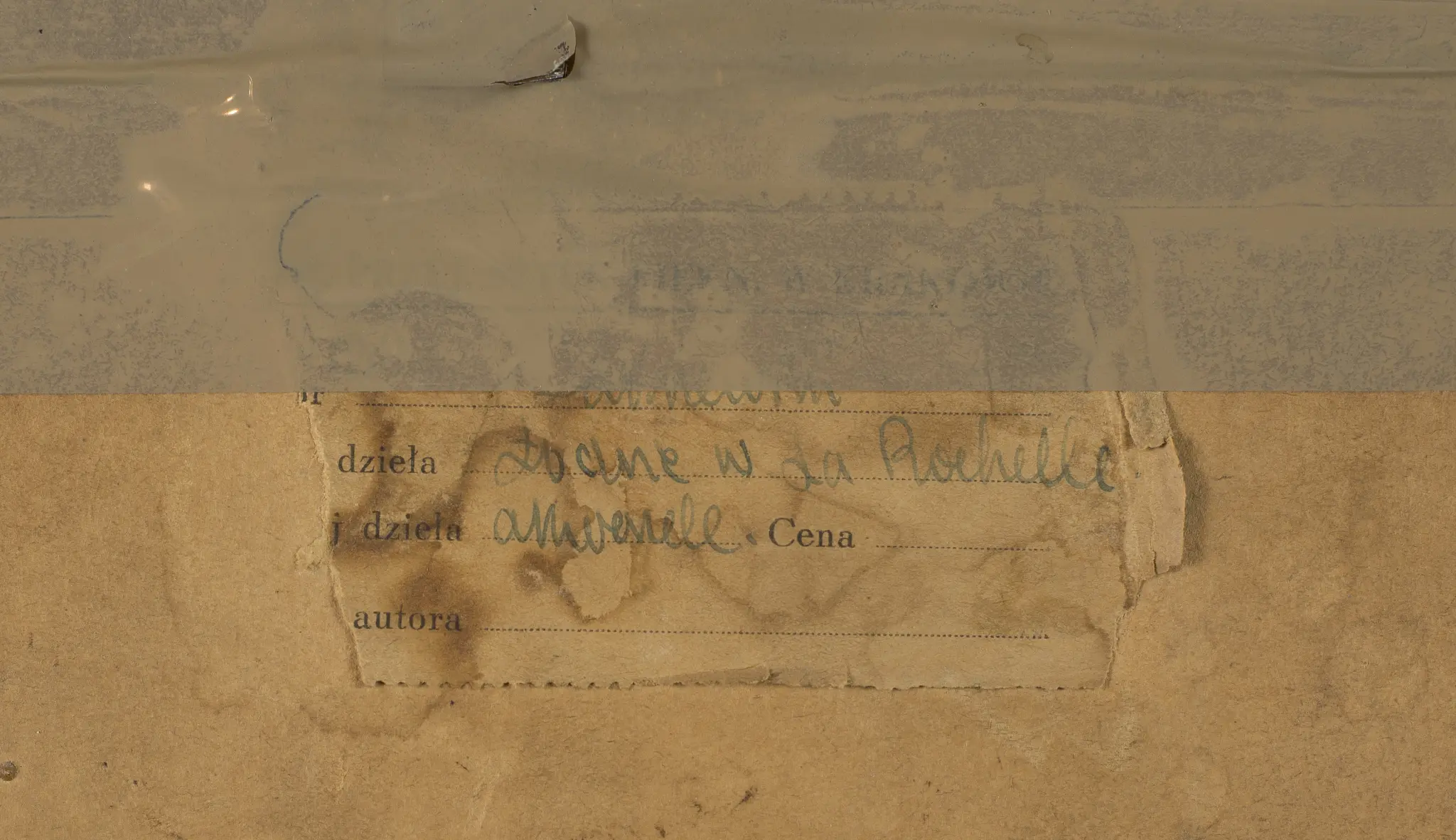 akwarela, papier, 28 x 33 cm, sygn. p.d.: Zakrzewski La Rochelle; 2 naklejki: z wystawy w TPSP w Krakowie, 1938 r. (W porcie) oraz pośmiertnej w TPSP w Krakowie, 1947 r., poz. 100 (W porcie La Rochelle).