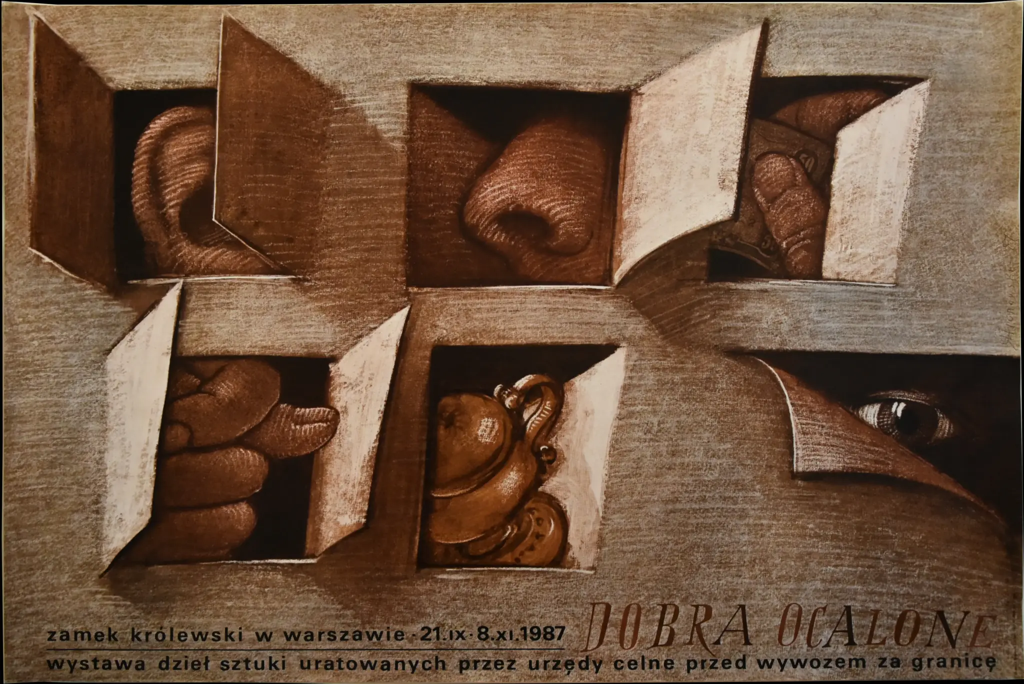 Plakat wystawowy, Dobra ocalone, Zamek Królewski w Warszawie 8 XI 1987 - wystawa dzieł sztuki uratowanych przez urzędy celne przed wywozem za granicę, sygn.: p.ś. M. Górowski 87, 67 X 98 cm. Stan dobry.