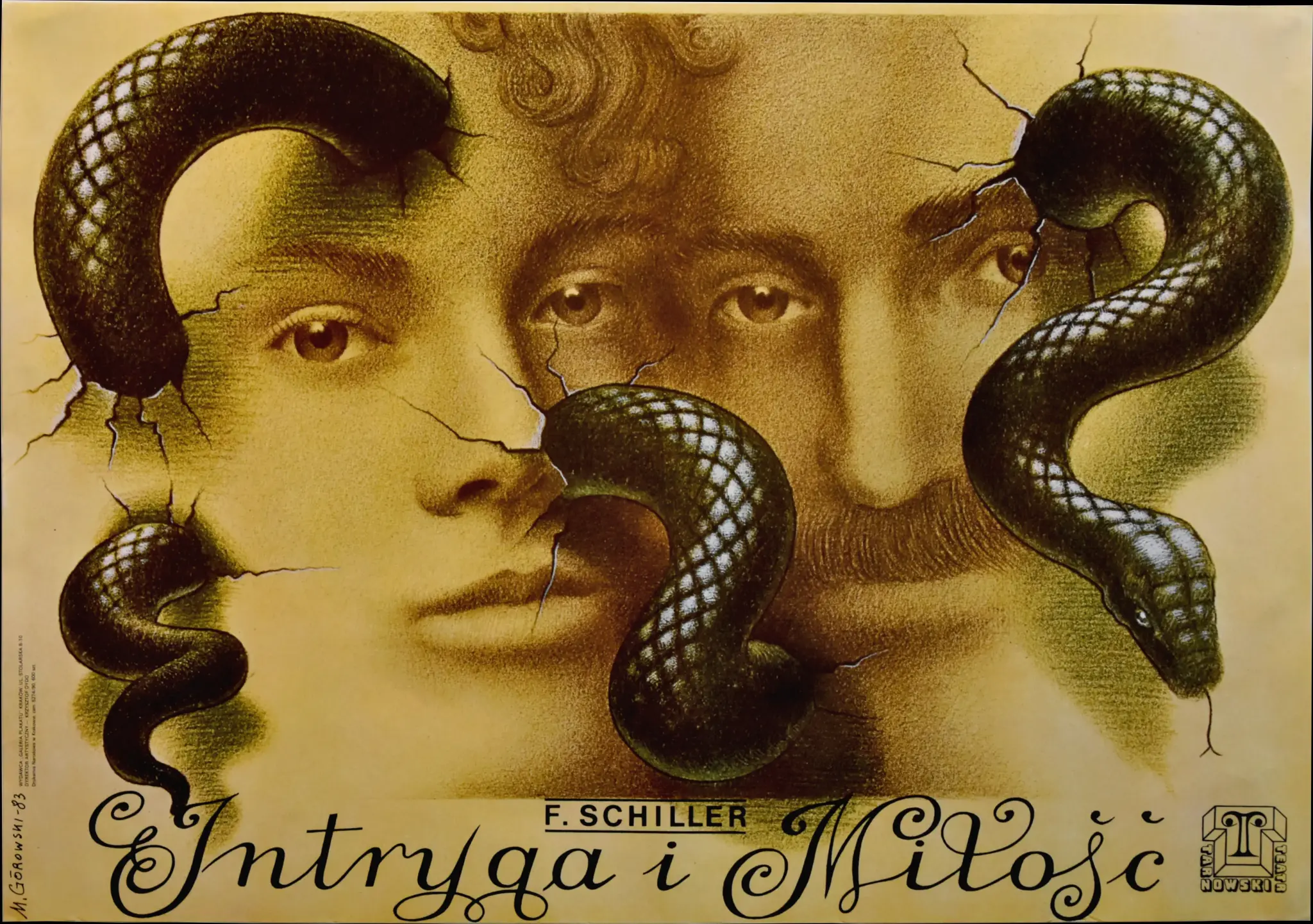 Plakat teatralny ze spektaklu Intryga i Miłość wg F. Schillera, Tarnowski Teatr, sygn.: l.d. M. Górowski 83, 83 x 59 cm. Stan dobry.