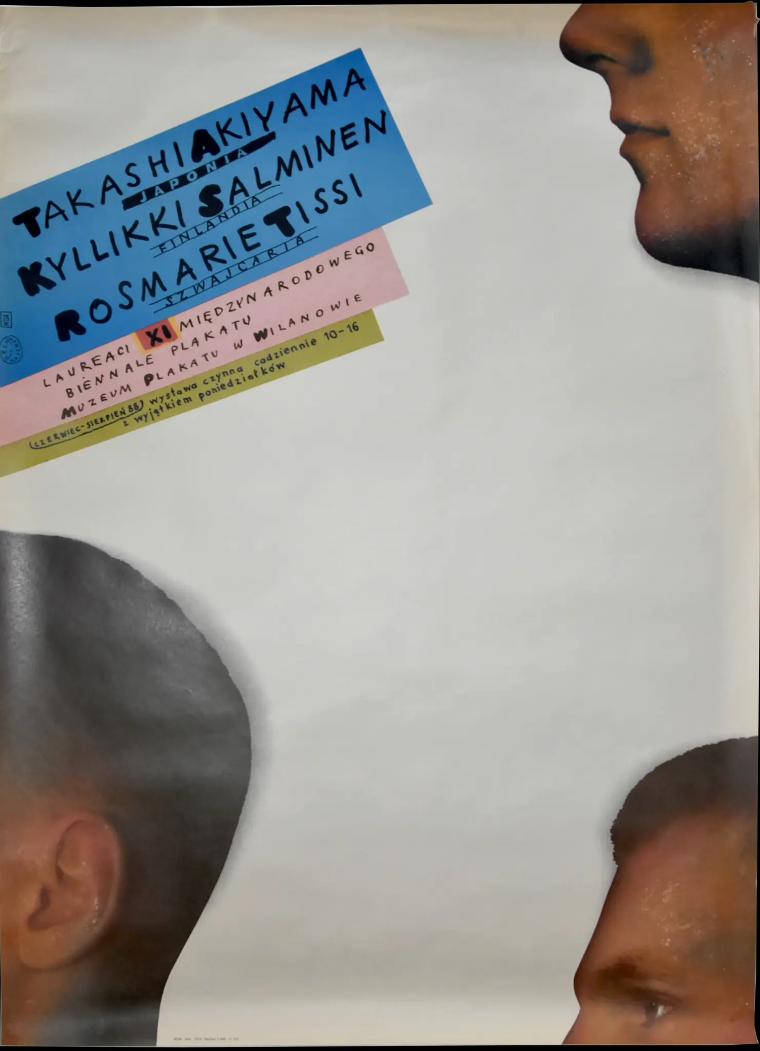 Muz. Plakatu w Wilanowie, Takashi Akiyama z Japonii, Killikki Salminen z Finlandii, Rosmarie Tissi ze Szwajcarii: Laureaci XI międzynarodowego Biennale Plakatu, czerwiec - sierpień 1988, 93 x 65,5 cm. Stan - na odwrocie ślady po podklejeniu.