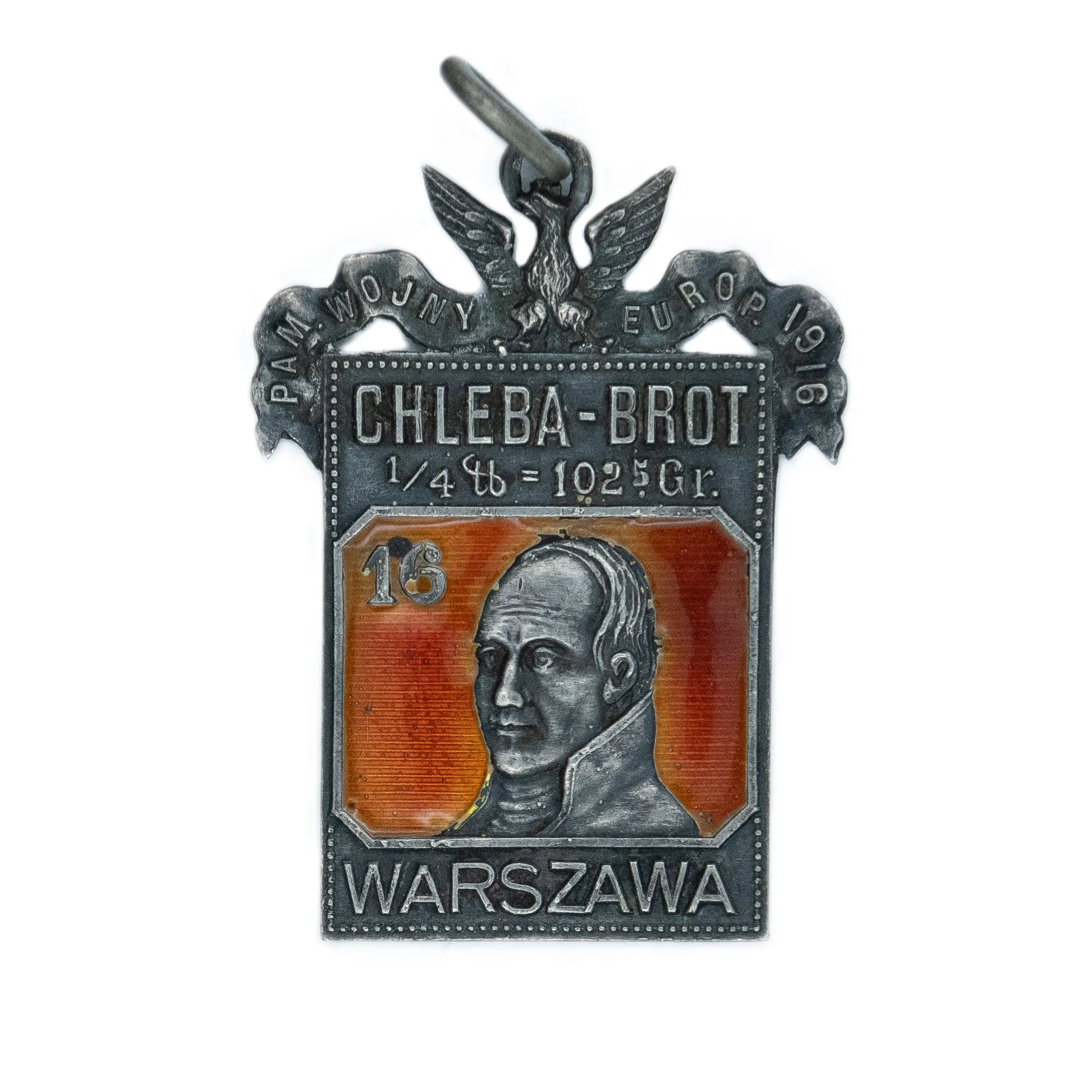 Medal / żeton pamiątka Kartek Żywnościowych w Warszawie z 1916 roku. 30x22 mm. Wykonana w srebrze, emaliowana. Bardzo rzadka wersja ; prostokątna plakietka zwieńczona Orzełkiem i wstęgą z napisem PAM. WOJNY EUROP 1916. W środku popiersie S. Staszica i cyfra 16 oraz napisy: u góry CHLEBA-BROT/1/4U=102 5GR, u dołu WARSZAWA; Małgorzata Dubrowska 89; Stan bardzo dobry. 7/18