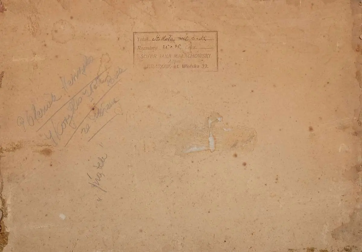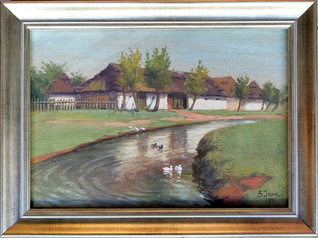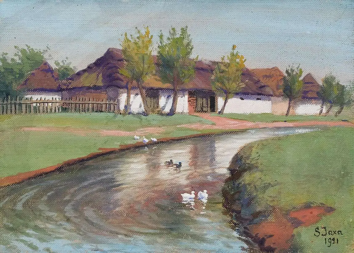 akwarela, gwasz, tektura, 25 x 35 cm, sygn. p.d.: S Jaxa / 1921 Na odwrocie stempel autorski z tytułem i wymiarami atramentem: Tytuł Stodoła nad wodą / Rozmiar 25 x 35 / Cena / Soter Jaxa Małachowski / Adres / Kraków ul. Wolska 32, oraz ołówkiem notatki firmy ramiarskiej. Stan zachowania: dr. zabrudzenia malatury w partii nieba.