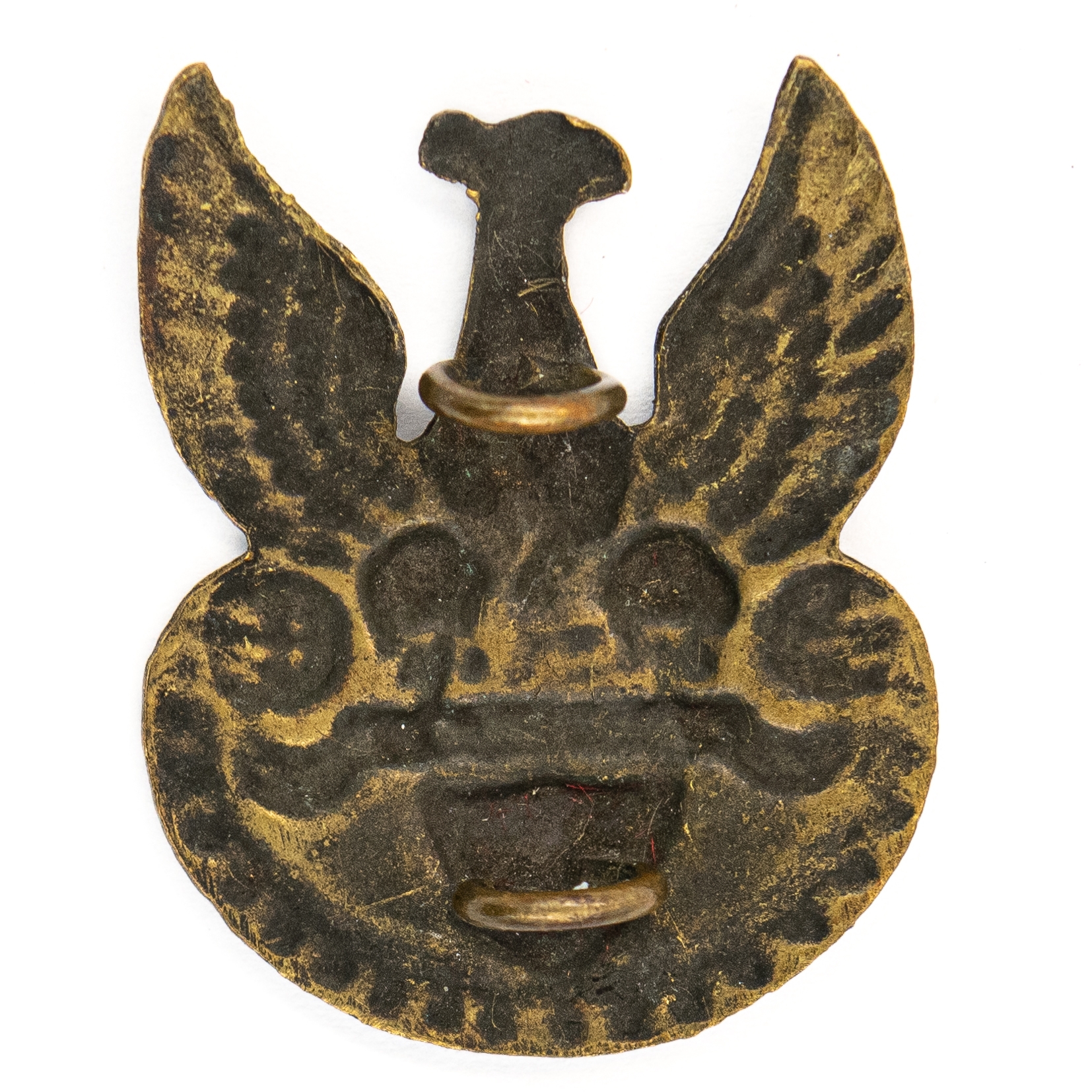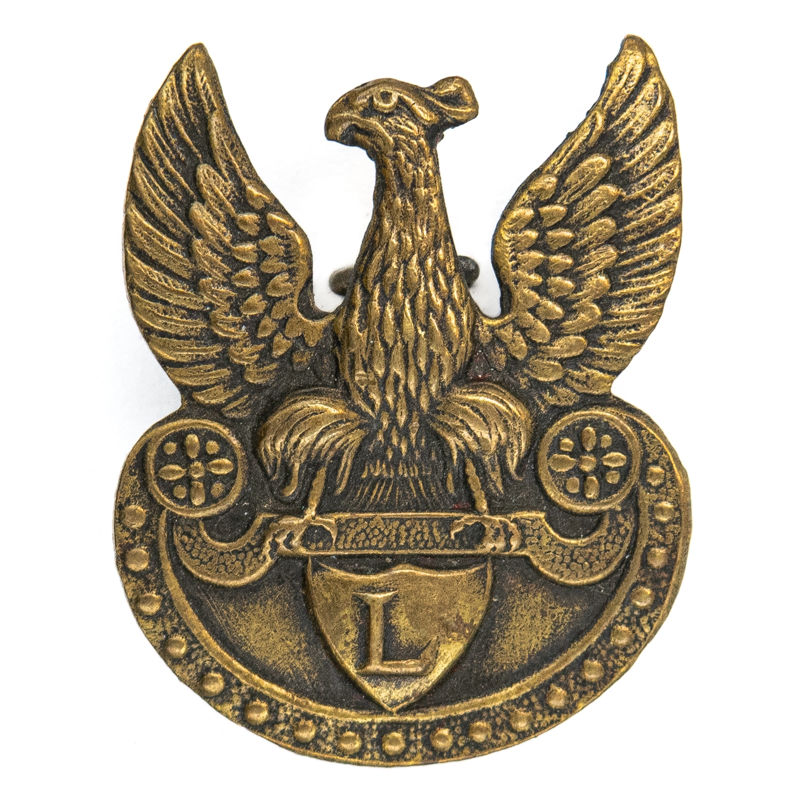 Orzeł legionowy, wersja z długą literą L. 37 x 29,5mm. Wykonany z mosiądzu. Jednoczęściowy, rewers z delikatną kontrą. Orzeł wykonywany w zakładzie Franciszka Zająca w Krakowie w 1914r. Analogiczne egzemplarze publikowane są w książce Tomasza Zawistowskiego, "Polskie orły do czapek w latach 1900-1917", str. 80. Stan bardzo dobry.