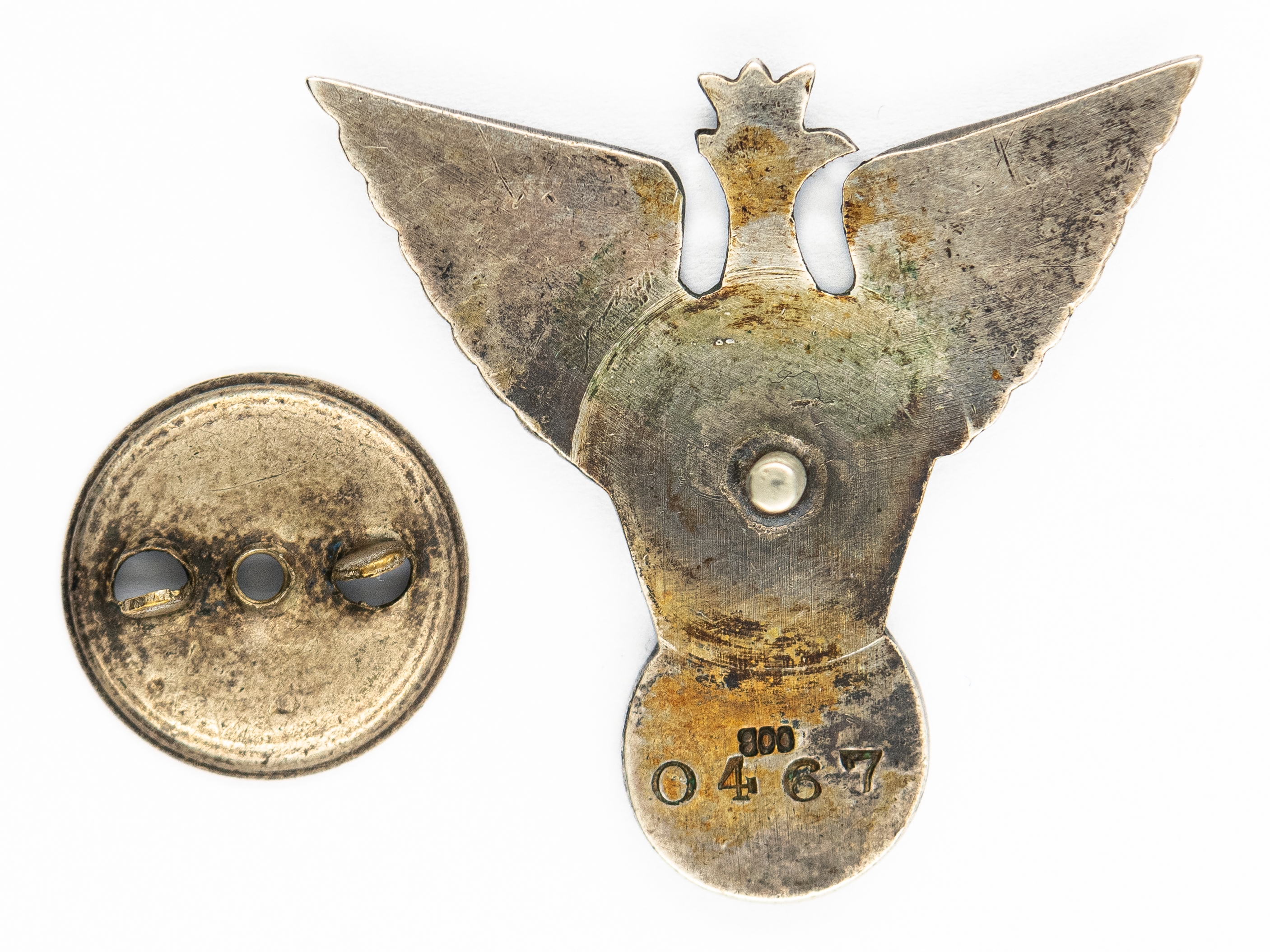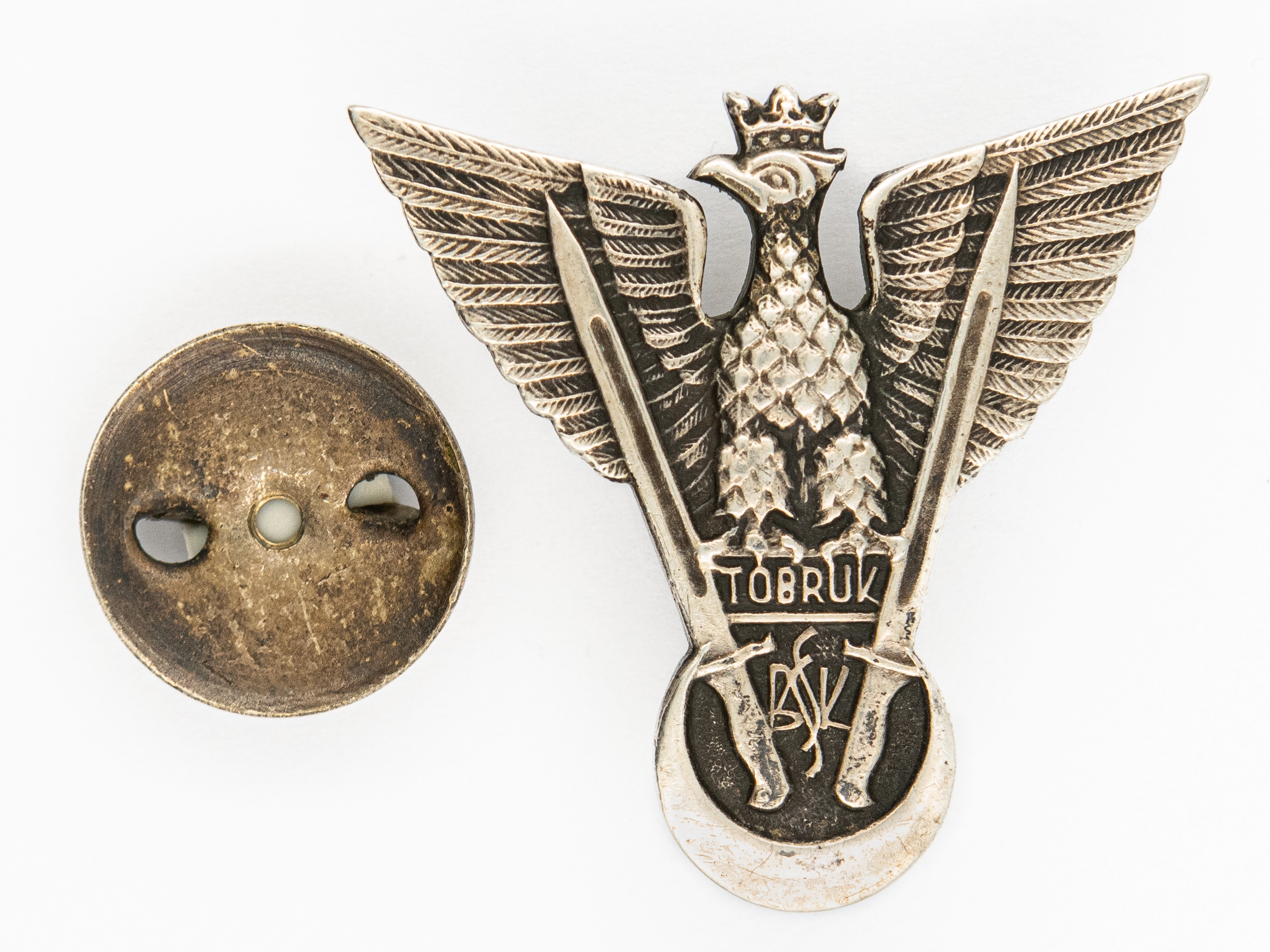 Odznaka Tobruk, Samodzielna Brygada Strzelców Karpackich. 49 x 46 mm, srebro. Odznaka jednoczęściowa. Rewers gładki, wybity numer: "0467" oraz próba "800". (SIERŻANT KOWALIK FELIKS 1910/21 SBSK P1 3DSK 1 BAT. SK). Mocowana na słupek z nakrętką. Nakrętka niesygnowana. Stan dobry.