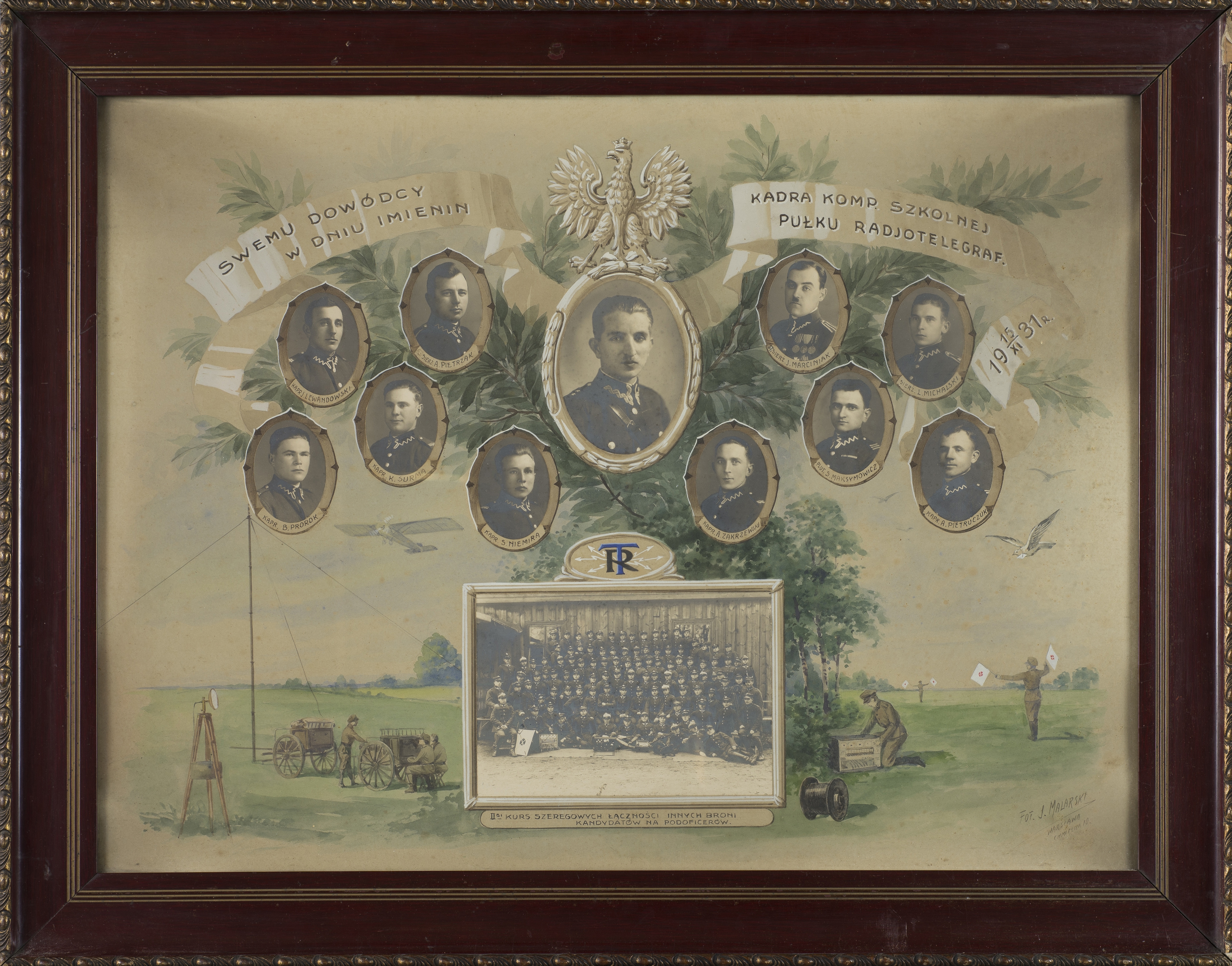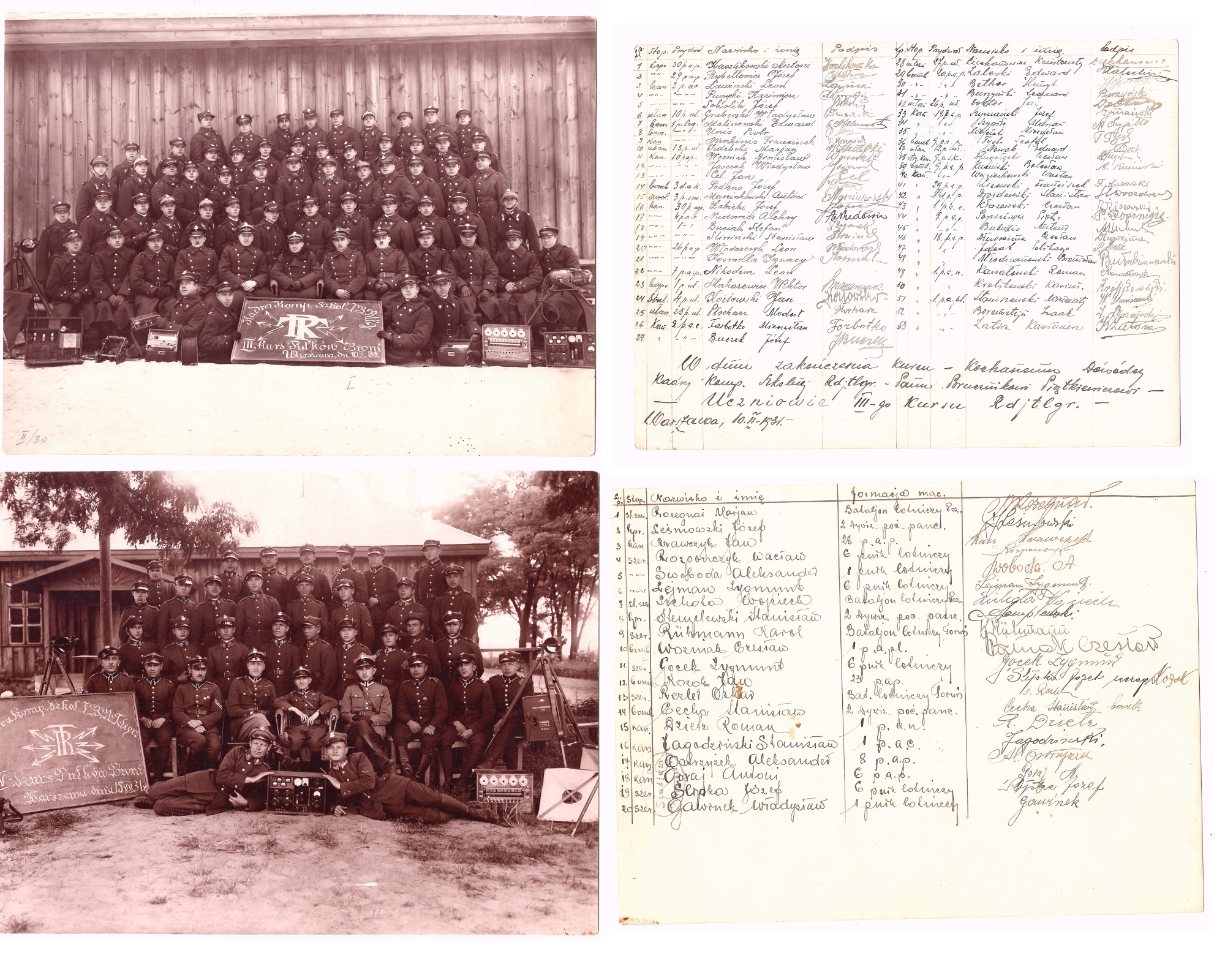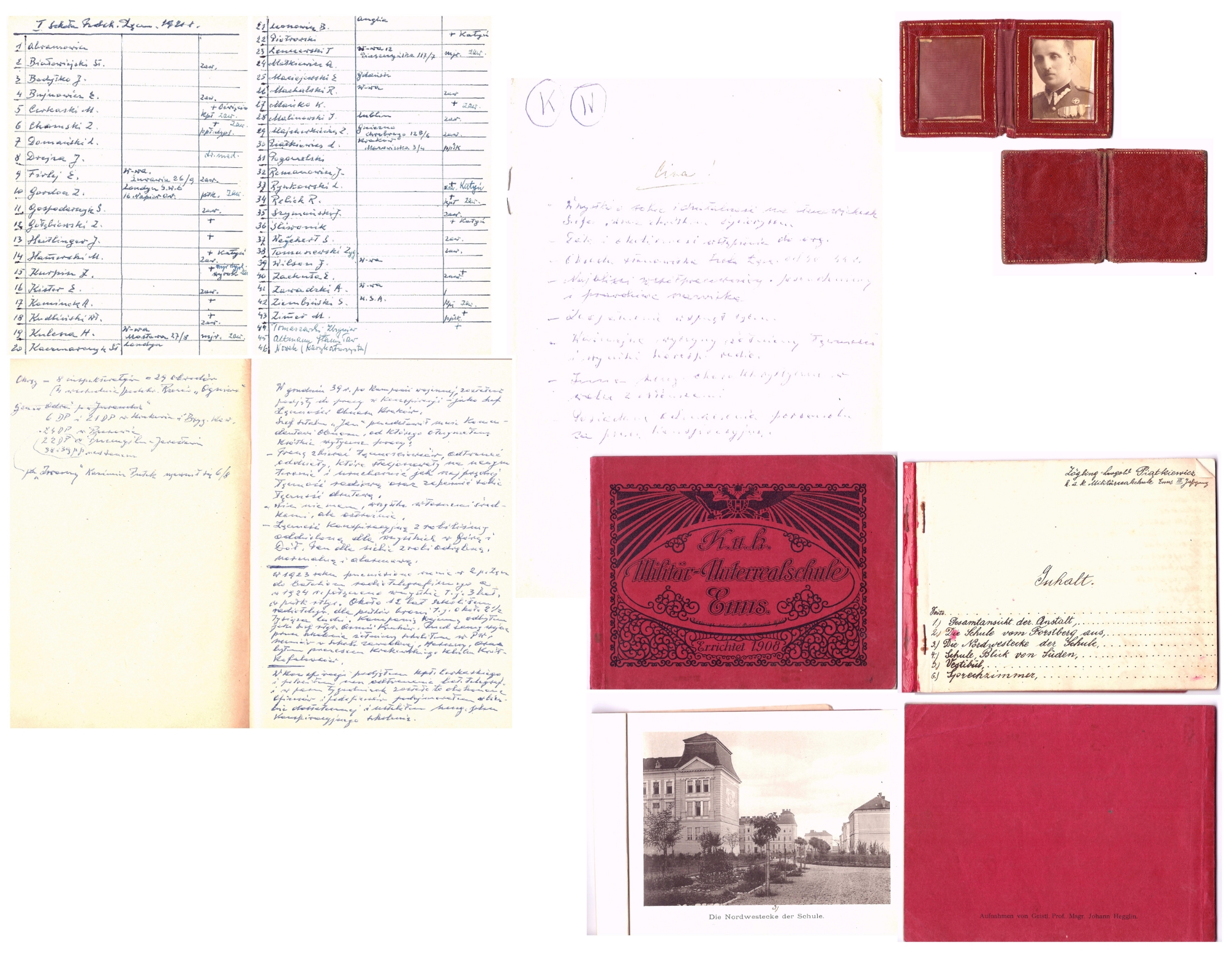 Zestaw pamiątek po Leopoldzie Piątkiewiczu: fotografie, dokumenty, odręczne zapiski razem 40 sztuk. Leopold Franciszek Piątkiewicz, (1901-1984) przybrane nazwisko Józef Wiśniewski, ps. "Bogdan" (Bohdan), "Echo", "Leopold" - podpułkownik łączności Wojska Polskiego. 1) Tabloux pamiątkowe "SWOJEMU DOWÓDCY W DNIU IMIENIN/KADRA KOMP. SZKOLNEJ PUŁKU RADJOTELEGRAF./15.XI.1931R.". W centralnej części medalion ze zdjęciem Leopolda Piątkiewicza, zwieńczony orłem w koronie, wokół w mniejszych medalionach zdjęcia podoficerów. Poniżej zdjęcie grupowe z opisem: "II-GI KURS SZEREGOWYCH ŁACZNOŚCI INNYCH BRONI KANDYDATÓW NA PODOFICERÓW". Sygn. p.d. : "FOT. J. MALARSKI / WARSZAWA CHMIELNA 10". W tle akwarela ze sceną tematyczną. Całość oprawiona drewnianą ramą ze szkłem, wym.: 72 x 91,5 cm. 2-7) Zdjęcia grupowe uczestników i kadry kursów radiotelegraficznych z lat 1931-1934, 6 sztuk, wym. ok.17x23 cm. W tym: Zdjęcie grupowe żołnierzy z tabliczką: "Kadra Komp. Szkol. I B. Rtlg. III. kurs Pułków Broni Warszawa, dn. 10. II. 31." Na odwrocie ręcznie wypełniona tabela z danymi uczestników kursu. Poniżej tekst z dedykacją oraz Zdjęcie grupowe żołnierzy z tabliczką: "Kadra Komp. Szkol. I B. R. Telegr. IV Kurs Pułków Broni Warszawa dnia 15.VII.31r.". Na odwrocie ręcznie wypełniona tabelą z danymi uczestników. 8-9) Zdjęcia grupowe uczestników kursów radiotelegraficznych- 2 sztuki, wym. ok. 8,5 x 13,5 cm. 10-13) Zdjęcia nieopisane, grupowe, 4 sztuki, wym. różne ok. 12 x 18 cm. 14-25) Zdjęcia grupowe, 12 sztuki, wym. różne. W tym jedno opisane: "I-a Szkoła Podch. W. Ł. Zegrze (...). Po nominacji. 1920. Kasyno oficerskie. Przewodniczący płk. Drewkowski (...)". 27) Zaświadczenie o ukończeniu kursu Szkoły Podchorążych Wojsk Łączności w 1920 r., 28) Zaświadczenie o uczestnictwie w egzaminie z "Tymczasowego regulaminu służby Łączności (...)" oraz "Tymczasowego regulaminu telefonicznej i telegraficznej służby (...)" z 1922 r., 29) Zaświadczenie o ukończeniu "Kursu doszkolenia oficerów korpusu łączności" z 1924 r. 30) Legitymacja Członkowska Polskiego Związku Zachodniego. 31) Maszynopis "Szczegółowy przebieg służby od 1/11(19)18 do 1/1 (19)45". 32) Odpis z zaświadczenia o opiece chirurga Dr. Stanisława Godalskiego w obozie przejściowym jenieckim w Dębiu w 1939. 33) Odpis z zaświadczenia o odznaczeniu Krzyżem Srebrnym Orderu Virtuti Militari z 1955 r. 34) Odpis z zaświadczenia o opiece lekarskiej Dr. med. Wł. Jaworskiego z powodu kontuzji po pobiciu przez Gestapo. 35) Życiorys Leopolda Piątkiewicza, maszynopis, 1975r., 36) Wydawnictwo pamiątkowe Cesarsko-Królewskiej Szkoły Wojennej w Enns z 1908 r., "K.uk. Militär-Unterrealschule Enns. Errichtet 1908", 13 x 17 cm, 25stron. Oprawa miękka, czerwono-czarna. Wewnątrz zdjęcia zabudowań, pomieszczeń oraz zdjęcia pamiątkowe absolwentów. Notatki piórem na pierwszej karcie albumu. Zagięcie prawego górnego rogu tyłu oprawy. W zestawie zdjęcie z nazwiskami uczniów. 37) Zdjęcie legitymacyjne w mundurze z odznaczeniami, 4,5 x 5,8 cm. 38) Kartonik z odręczną listą uczestników "I Szkoły Podch. Łączn. 1921 r.". 14,9 x 10,5 cm. 39) Notatnik osobisty oznaczony literami "K W". 20,6 x 14,6 cm. Zapisane 10 stron, brak okładki. 40) Zeszyt z notatkami odręcznymi dot. działalności konspiracyjnej. Zapisane 17stron. Stany zachowania obiektów zróżnicowane, z widocznymi zagięciami i śladami używania.