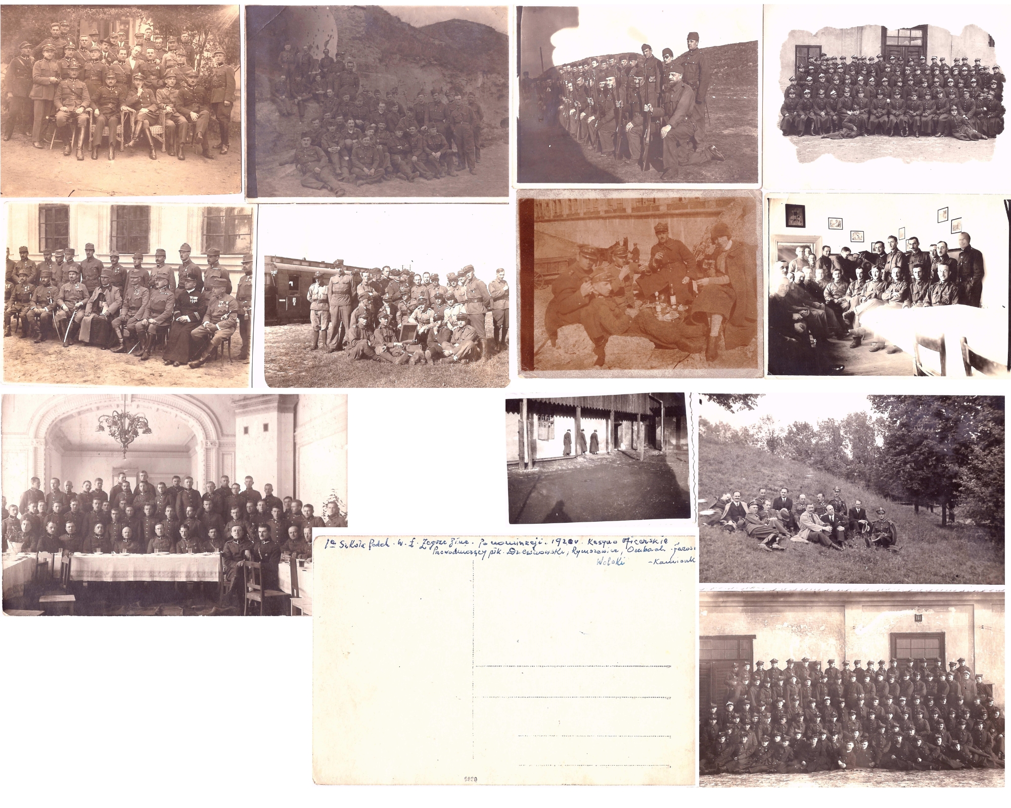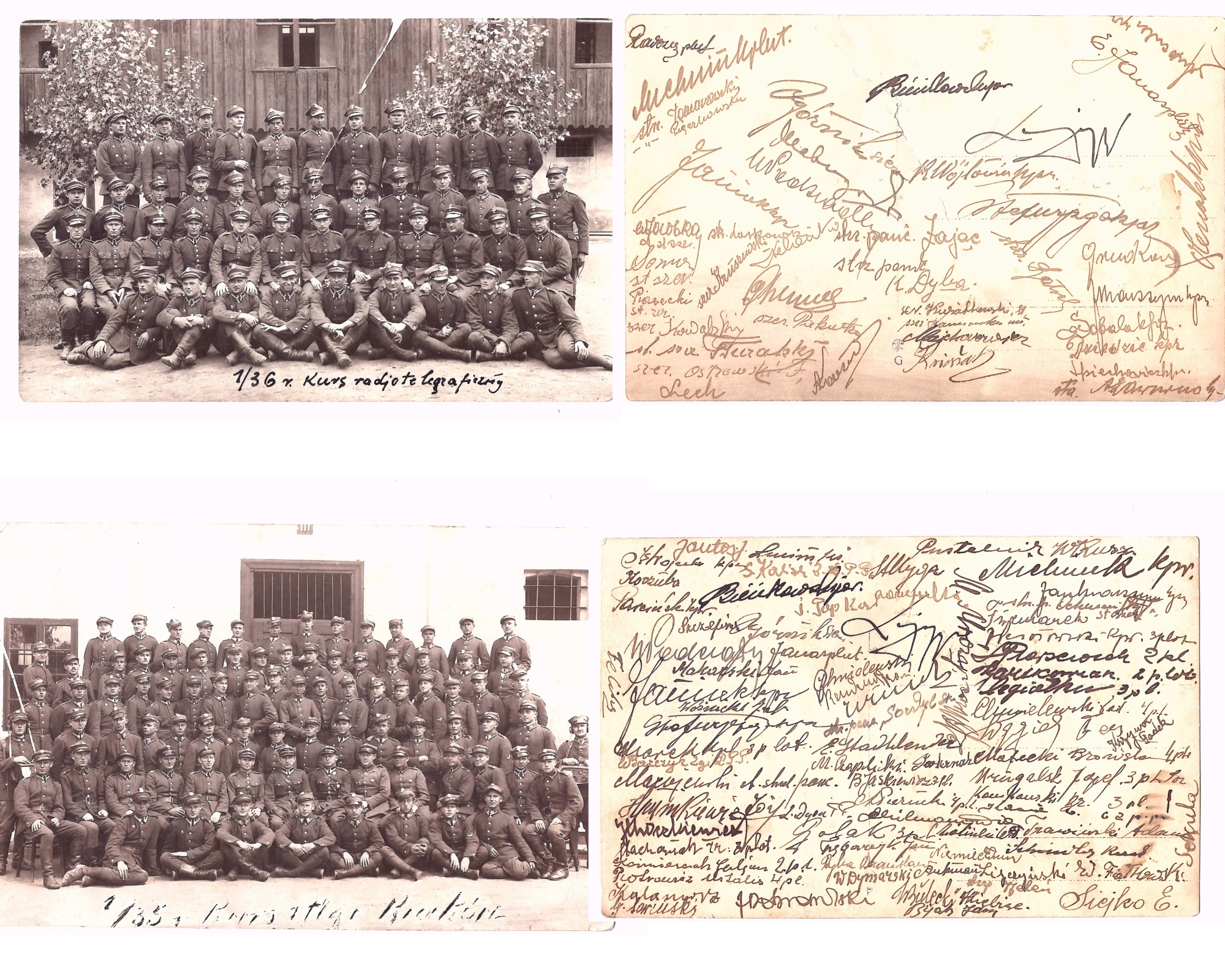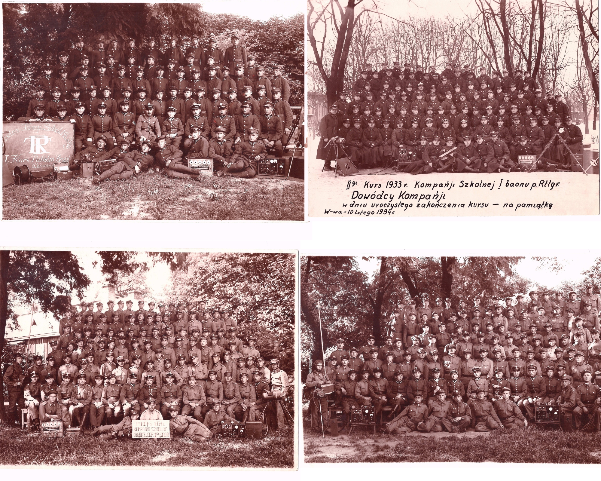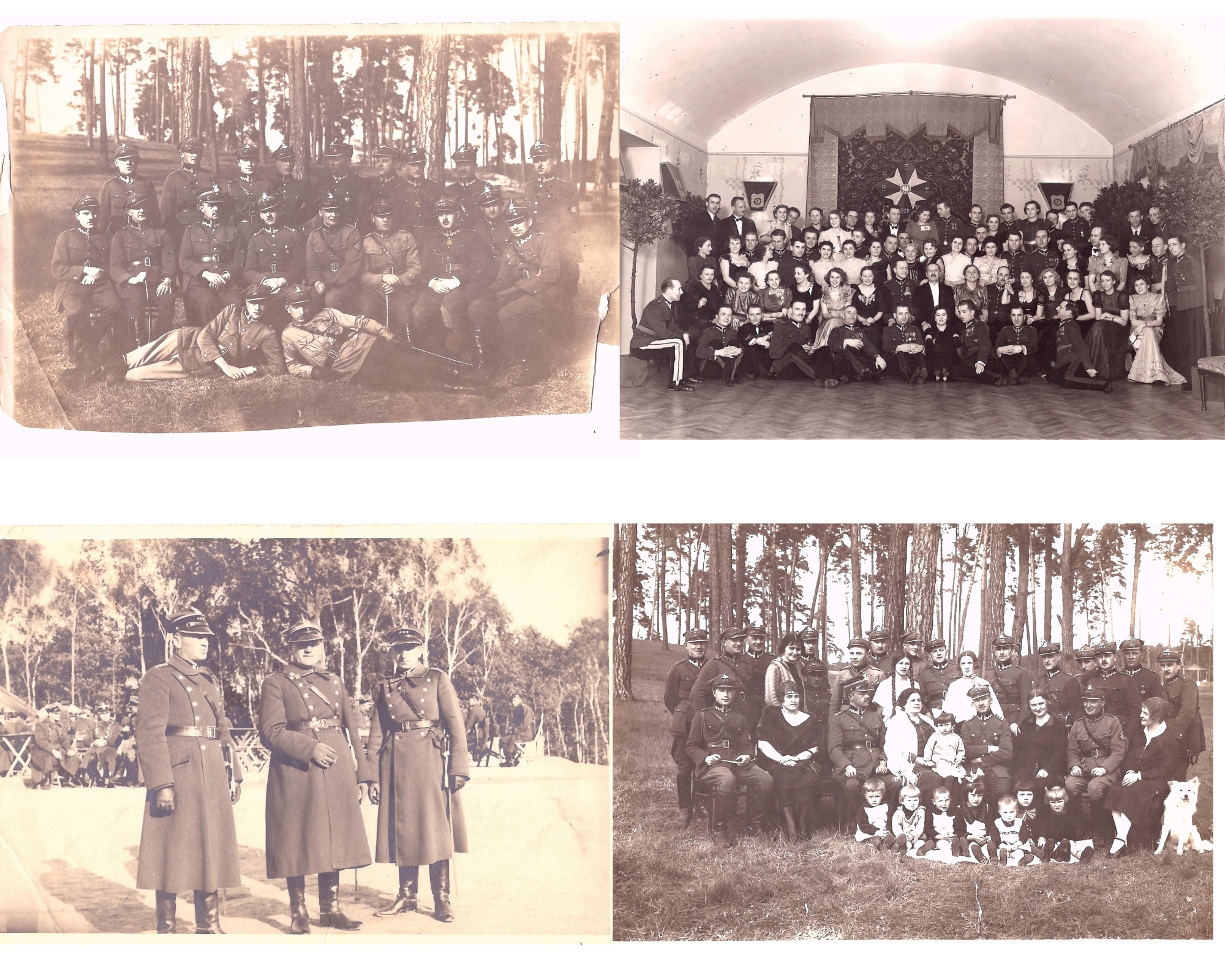 Zestaw pamiątek po Leopoldzie Piątkiewiczu: fotografie, dokumenty, odręczne zapiski razem 40 sztuk. Leopold Franciszek Piątkiewicz, (1901-1984) przybrane nazwisko Józef Wiśniewski, ps. "Bogdan" (Bohdan), "Echo", "Leopold" - podpułkownik łączności Wojska Polskiego. 1) Tabloux pamiątkowe "SWOJEMU DOWÓDCY W DNIU IMIENIN/KADRA KOMP. SZKOLNEJ PUŁKU RADJOTELEGRAF./15.XI.1931R.". W centralnej części medalion ze zdjęciem Leopolda Piątkiewicza, zwieńczony orłem w koronie, wokół w mniejszych medalionach zdjęcia podoficerów. Poniżej zdjęcie grupowe z opisem: "II-GI KURS SZEREGOWYCH ŁACZNOŚCI INNYCH BRONI KANDYDATÓW NA PODOFICERÓW". Sygn. p.d. : "FOT. J. MALARSKI / WARSZAWA CHMIELNA 10". W tle akwarela ze sceną tematyczną. Całość oprawiona drewnianą ramą ze szkłem, wym.: 72 x 91,5 cm. 2-7) Zdjęcia grupowe uczestników i kadry kursów radiotelegraficznych z lat 1931-1934, 6 sztuk, wym. ok.17x23 cm. W tym: Zdjęcie grupowe żołnierzy z tabliczką: "Kadra Komp. Szkol. I B. Rtlg. III. kurs Pułków Broni Warszawa, dn. 10. II. 31." Na odwrocie ręcznie wypełniona tabela z danymi uczestników kursu. Poniżej tekst z dedykacją oraz Zdjęcie grupowe żołnierzy z tabliczką: "Kadra Komp. Szkol. I B. R. Telegr. IV Kurs Pułków Broni Warszawa dnia 15.VII.31r.". Na odwrocie ręcznie wypełniona tabelą z danymi uczestników. 8-9) Zdjęcia grupowe uczestników kursów radiotelegraficznych- 2 sztuki, wym. ok. 8,5 x 13,5 cm. 10-13) Zdjęcia nieopisane, grupowe, 4 sztuki, wym. różne ok. 12 x 18 cm. 14-25) Zdjęcia grupowe, 12 sztuki, wym. różne. W tym jedno opisane: "I-a Szkoła Podch. W. Ł. Zegrze (...). Po nominacji. 1920. Kasyno oficerskie. Przewodniczący płk. Drewkowski (...)". 27) Zaświadczenie o ukończeniu kursu Szkoły Podchorążych Wojsk Łączności w 1920 r., 28) Zaświadczenie o uczestnictwie w egzaminie z "Tymczasowego regulaminu służby Łączności (...)" oraz "Tymczasowego regulaminu telefonicznej i telegraficznej służby (...)" z 1922 r., 29) Zaświadczenie o ukończeniu "Kursu doszkolenia oficerów korpusu łączności" z 1924 r. 30) Legitymacja Członkowska Polskiego Związku Zachodniego. 31) Maszynopis "Szczegółowy przebieg służby od 1/11(19)18 do 1/1 (19)45". 32) Odpis z zaświadczenia o opiece chirurga Dr. Stanisława Godalskiego w obozie przejściowym jenieckim w Dębiu w 1939. 33) Odpis z zaświadczenia o odznaczeniu Krzyżem Srebrnym Orderu Virtuti Militari z 1955 r. 34) Odpis z zaświadczenia o opiece lekarskiej Dr. med. Wł. Jaworskiego z powodu kontuzji po pobiciu przez Gestapo. 35) Życiorys Leopolda Piątkiewicza, maszynopis, 1975r., 36) Wydawnictwo pamiątkowe Cesarsko-Królewskiej Szkoły Wojennej w Enns z 1908 r., "K.uk. Militär-Unterrealschule Enns. Errichtet 1908", 13 x 17 cm, 25stron. Oprawa miękka, czerwono-czarna. Wewnątrz zdjęcia zabudowań, pomieszczeń oraz zdjęcia pamiątkowe absolwentów. Notatki piórem na pierwszej karcie albumu. Zagięcie prawego górnego rogu tyłu oprawy. W zestawie zdjęcie z nazwiskami uczniów. 37) Zdjęcie legitymacyjne w mundurze z odznaczeniami, 4,5 x 5,8 cm. 38) Kartonik z odręczną listą uczestników "I Szkoły Podch. Łączn. 1921 r.". 14,9 x 10,5 cm. 39) Notatnik osobisty oznaczony literami "K W". 20,6 x 14,6 cm. Zapisane 10 stron, brak okładki. 40) Zeszyt z notatkami odręcznymi dot. działalności konspiracyjnej. Zapisane 17stron. Stany zachowania obiektów zróżnicowane, z widocznymi zagięciami i śladami używania.