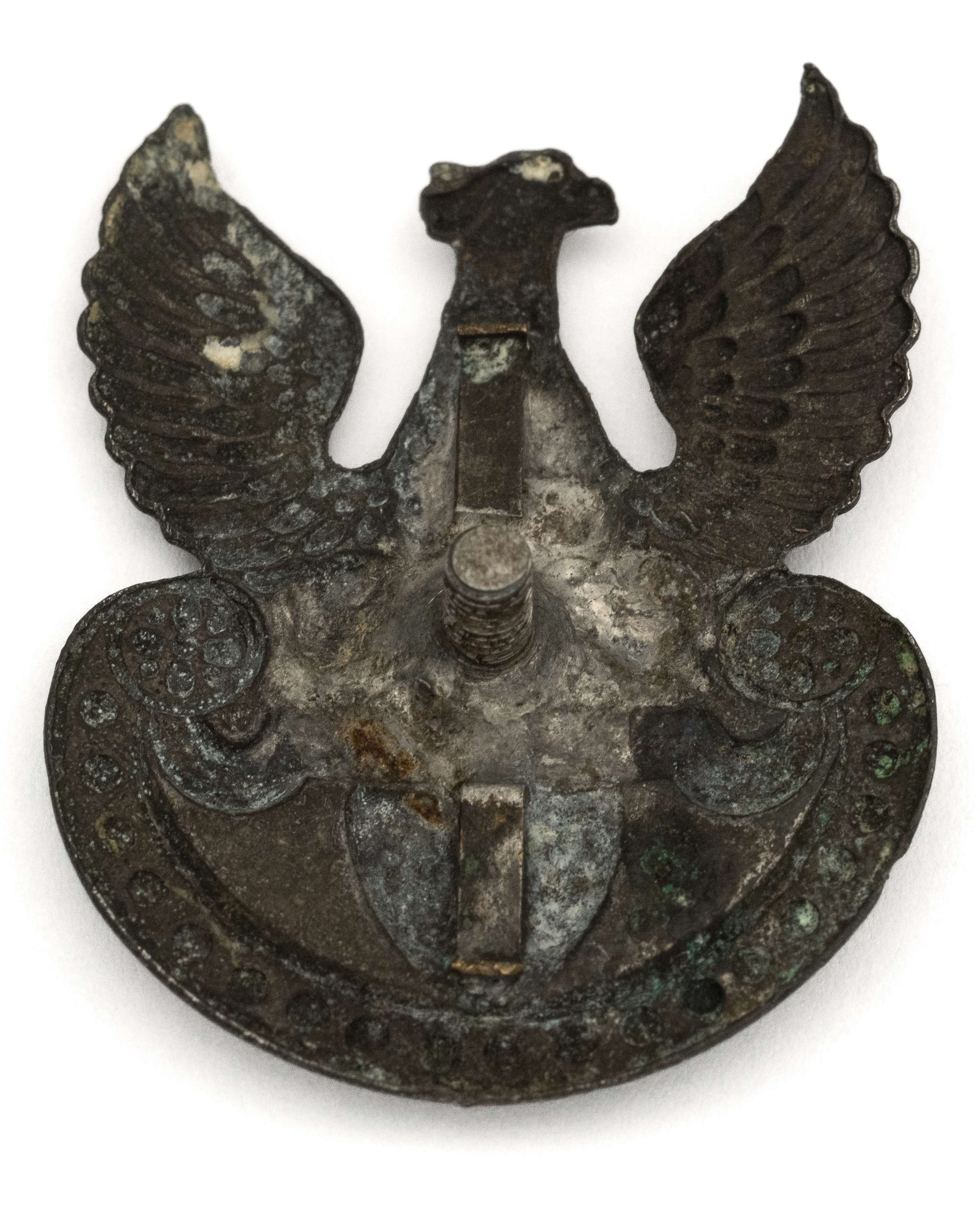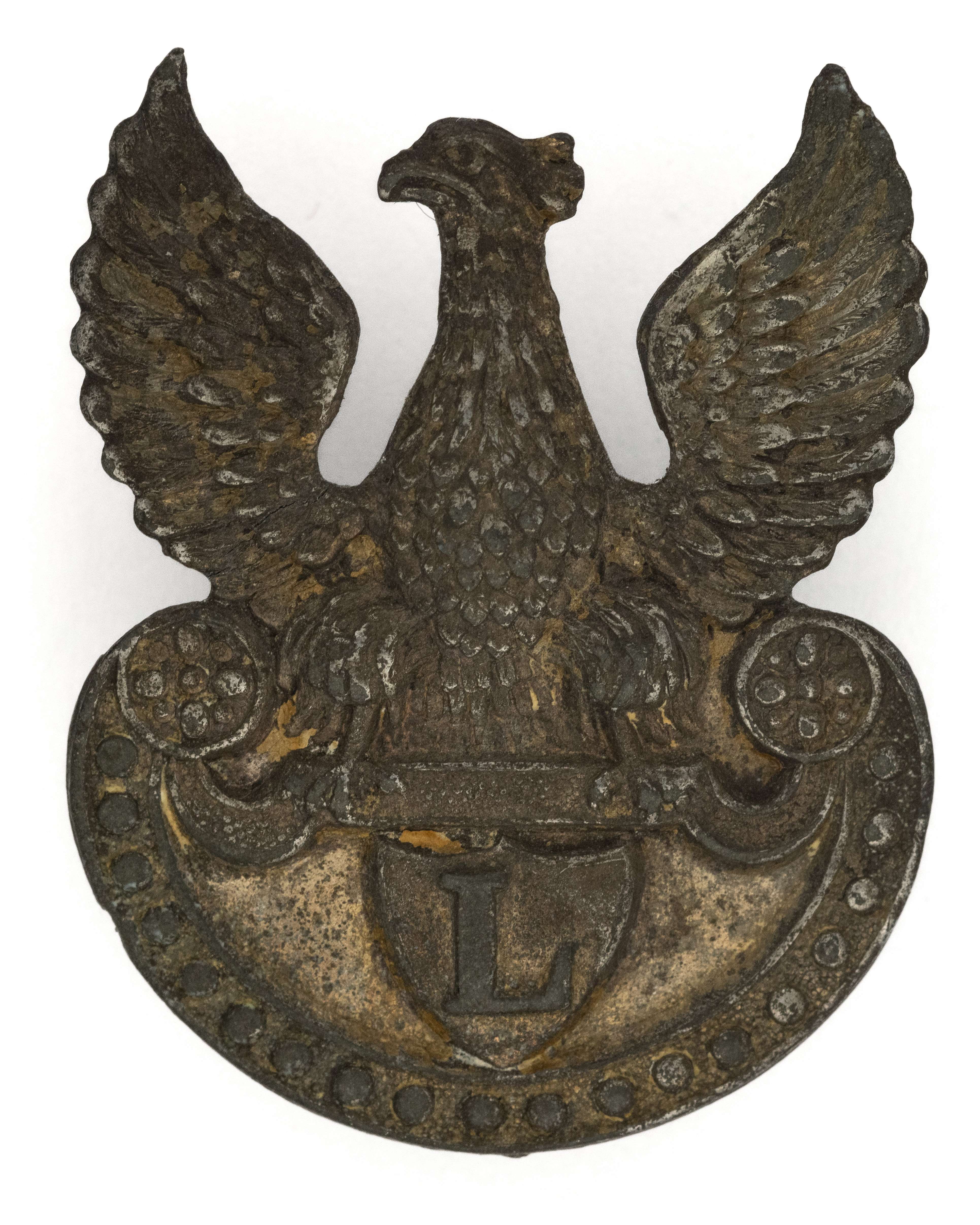 Orzeł z literą L - Kraków 1916; 38x30mm. Wykonany z blachy cynkowej. Rewers z kontrą. Brak oryginalnego mocowania - wtórnie przylutowany słupek. Lit. Tomasz Zawistowski, Polskie Orły do czapek w latach 1900-17, str.86. Stan bardzo dobry.