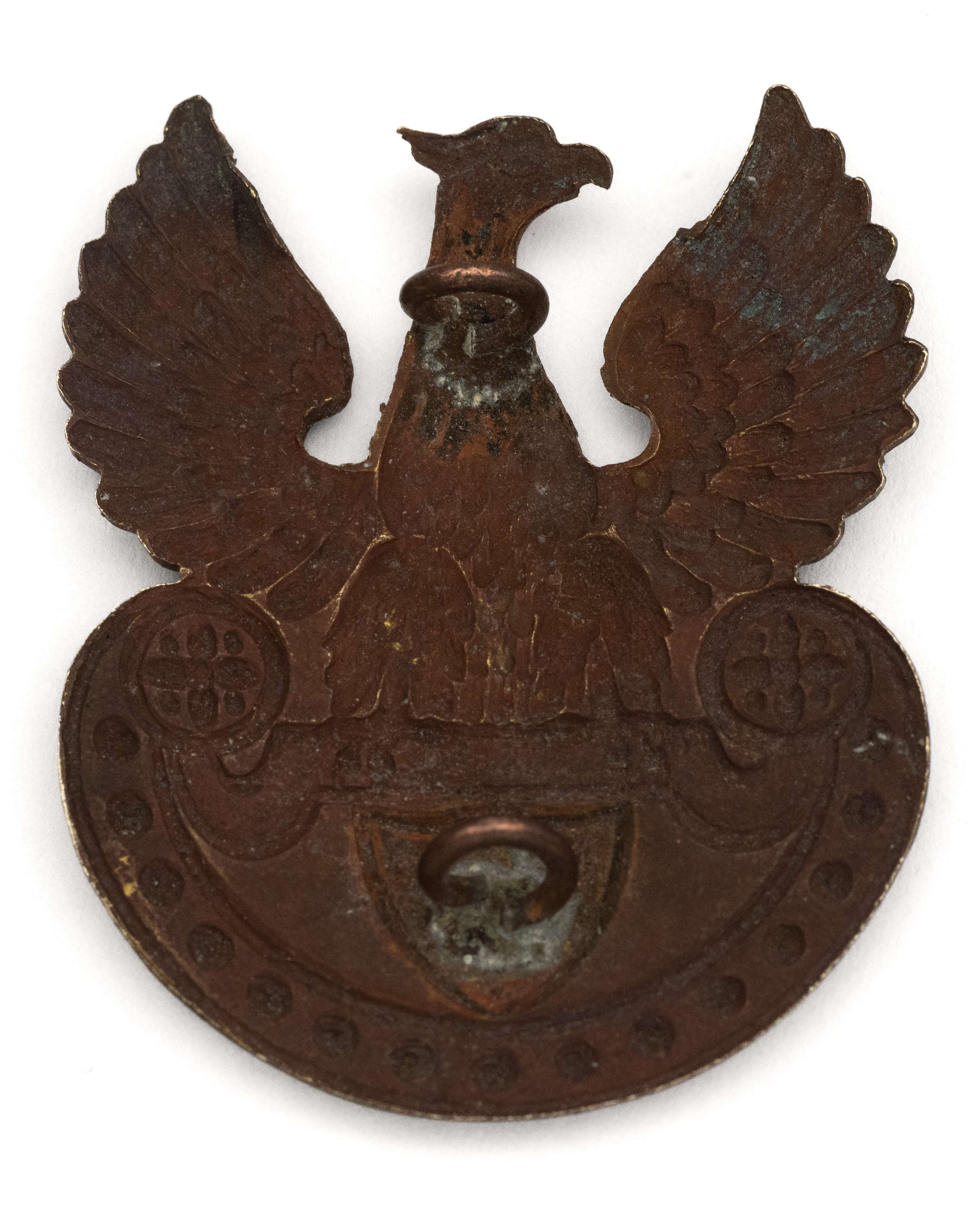 Orzeł z literą L - tzw "karpacki" Wiedeń 1915; 38x30mm. Wykonany z mosiądzu. Rewers z kontrą. Mocowany na dwie omegi. Lit. Tomasz Zawistowski, Polskie Orły do czapek w latach 1900-17, str. 114. Stan bardzo dobry.