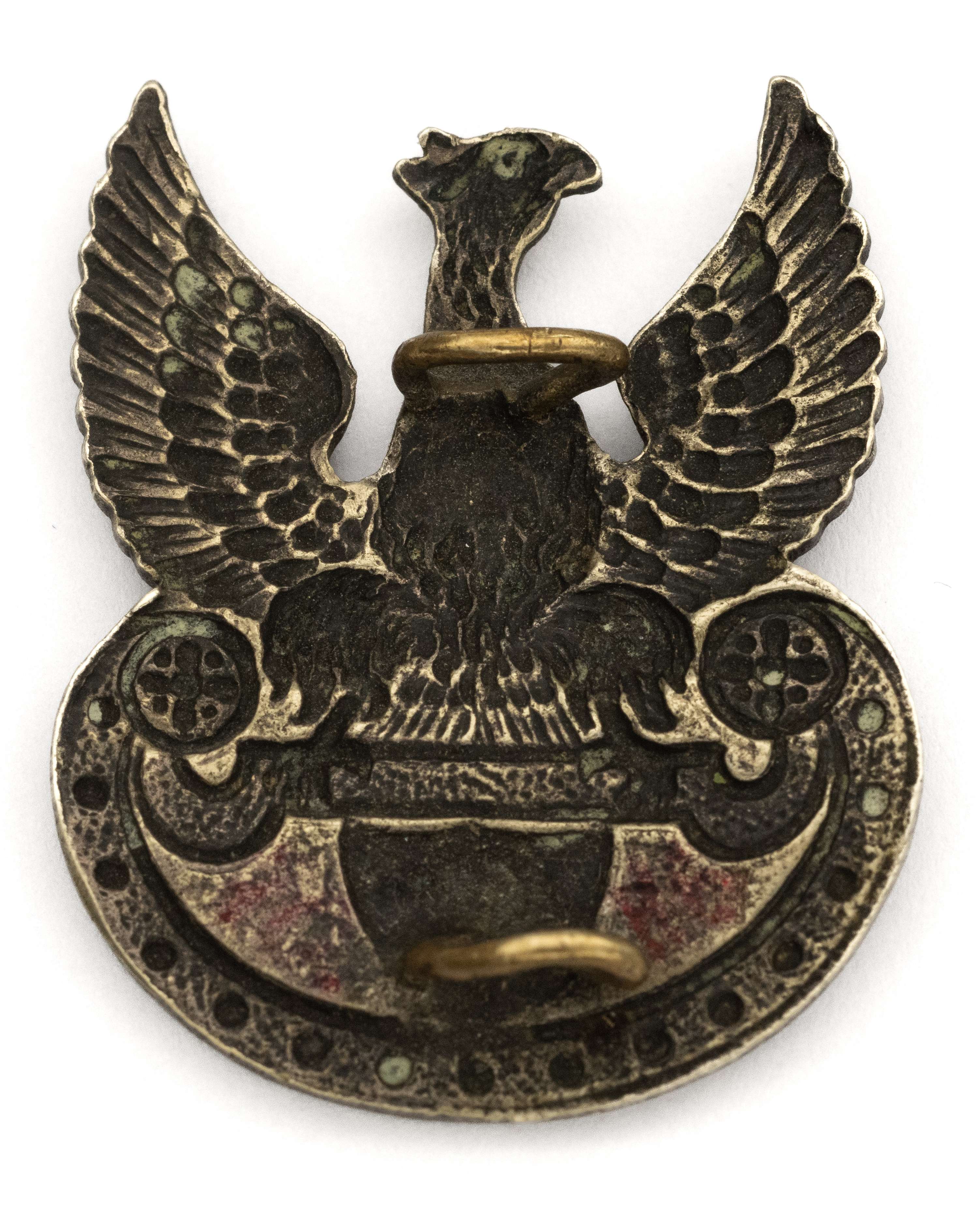 Orzeł z literą S - Kraków; 37x29mm. Wykonany z alpaki. Rewers z kontrą. Mocowanie na dwie omegi. Orły tego wzoru bito z matrycy próbnego orła. Lit. Tomasz Zawistowski, Polskie Orły do czapek w latach 1900-17, str.76. Stan bardzo dobry.